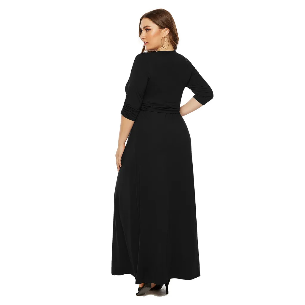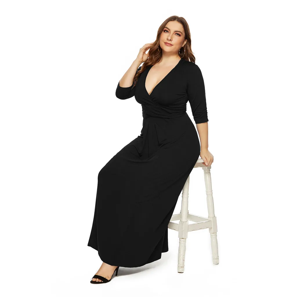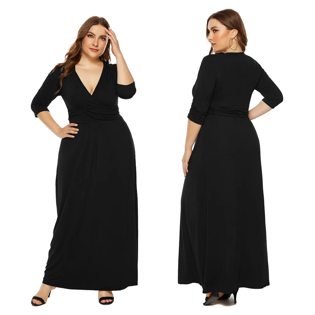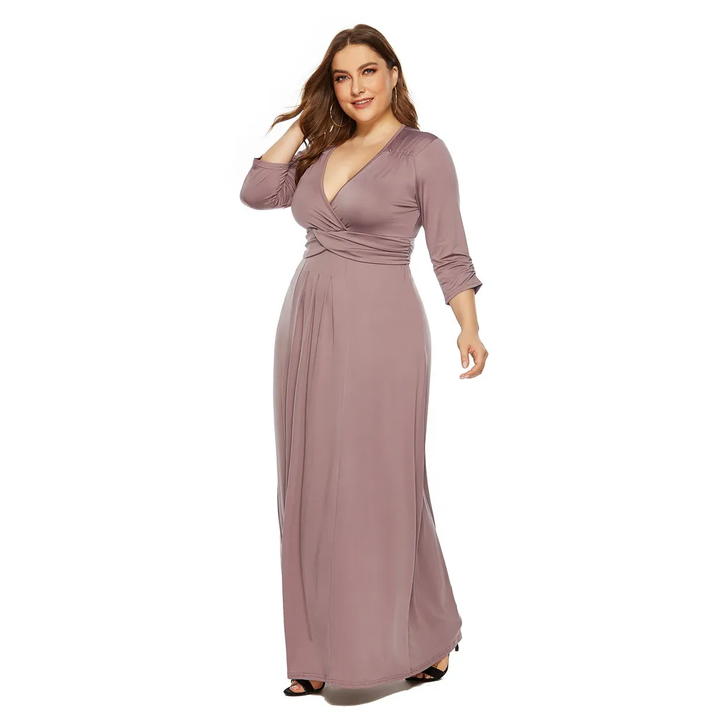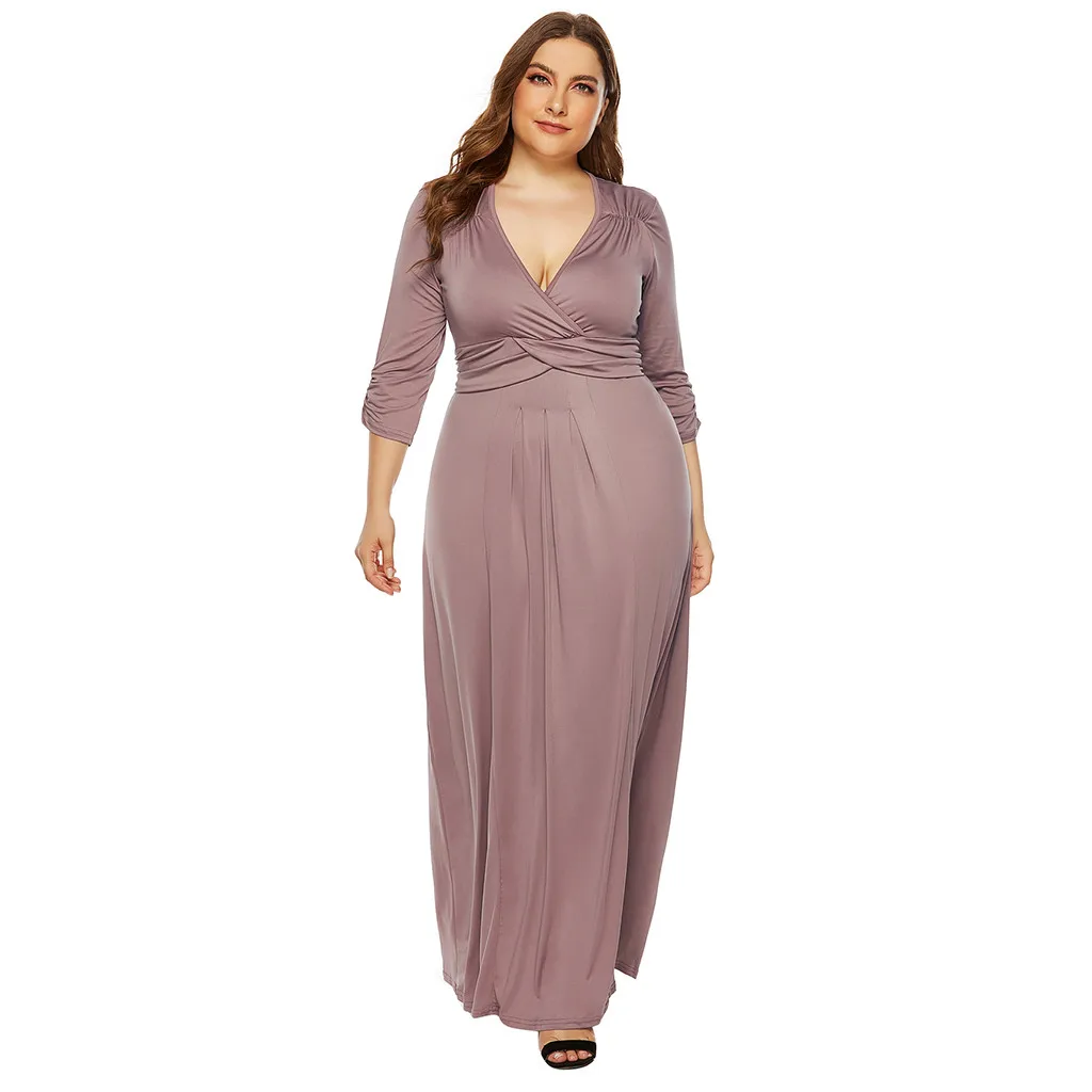 Женщины плюс размер случайные сплошной цвет v-образным вырезом Половина рукава складки стрейч тонкий платье