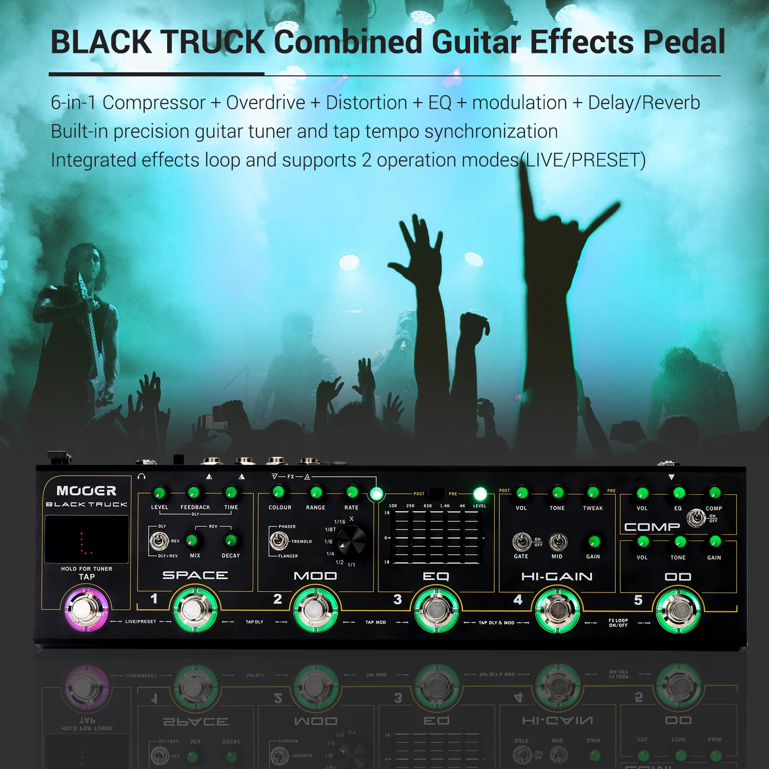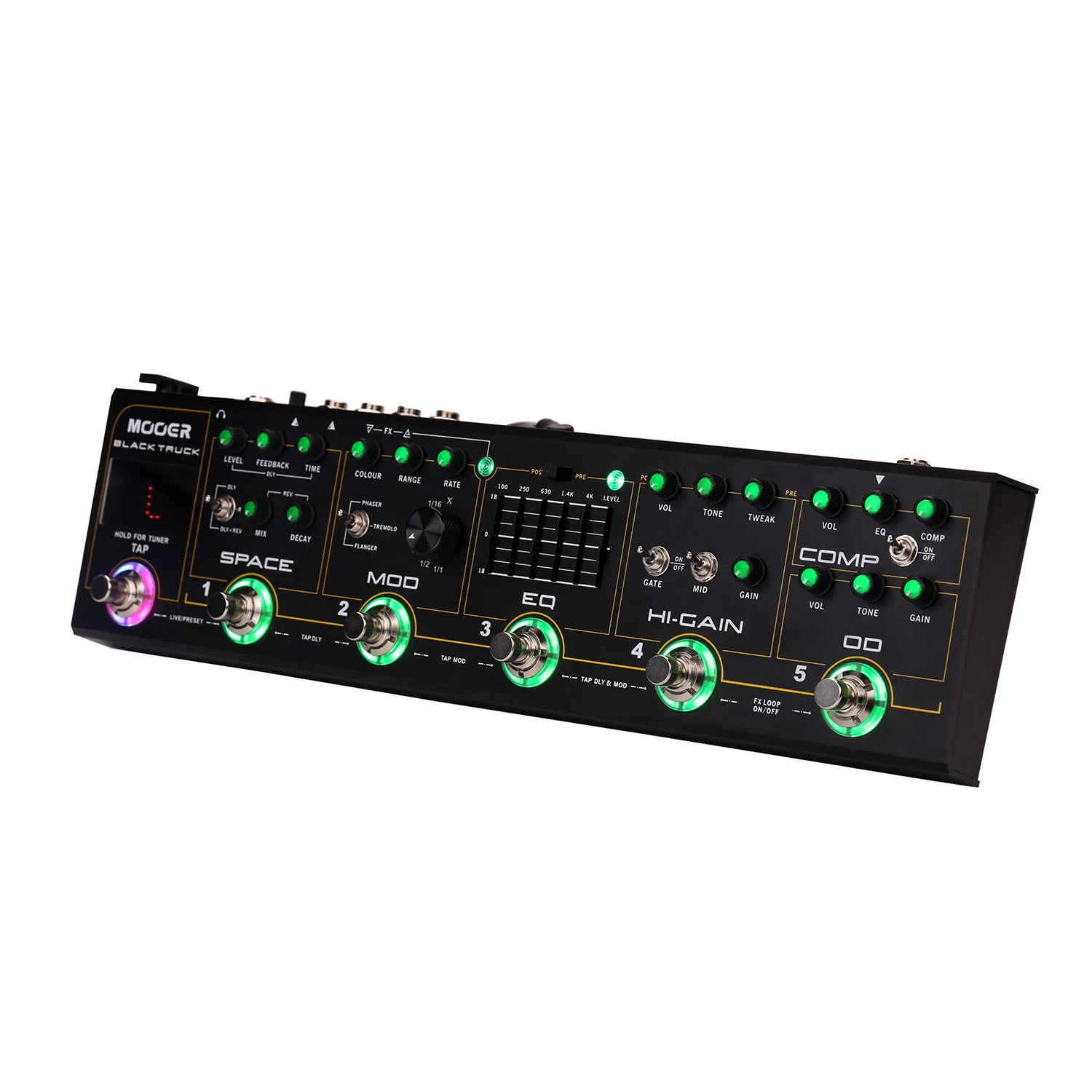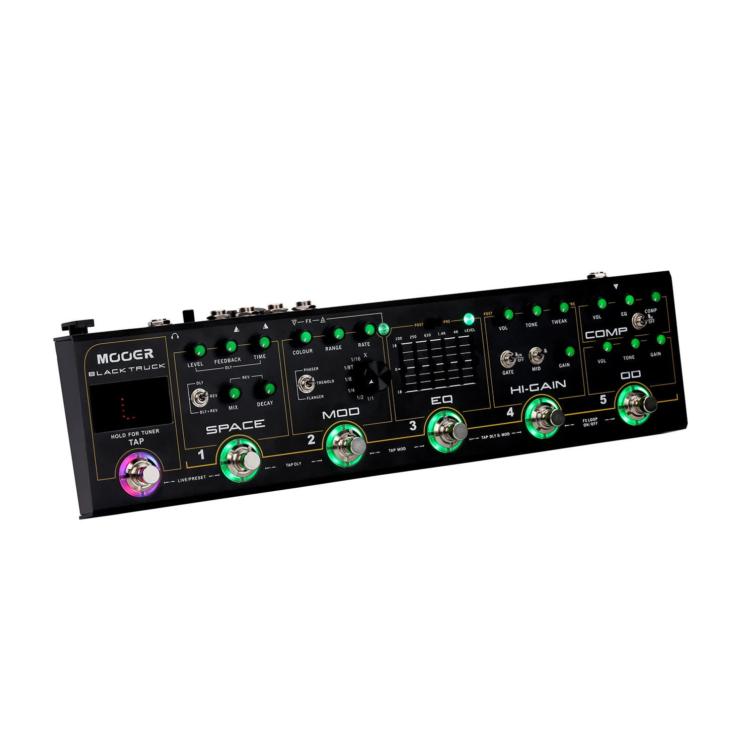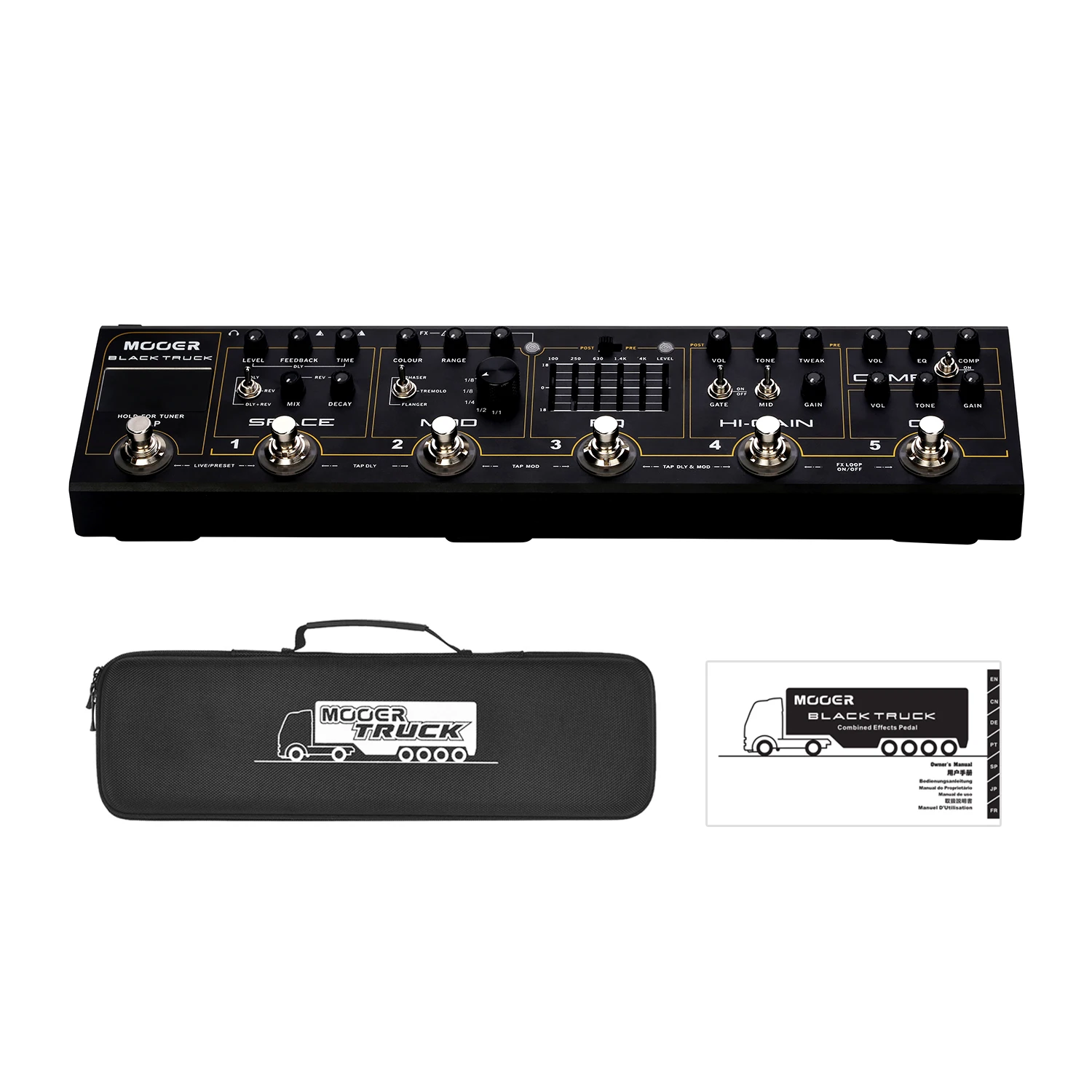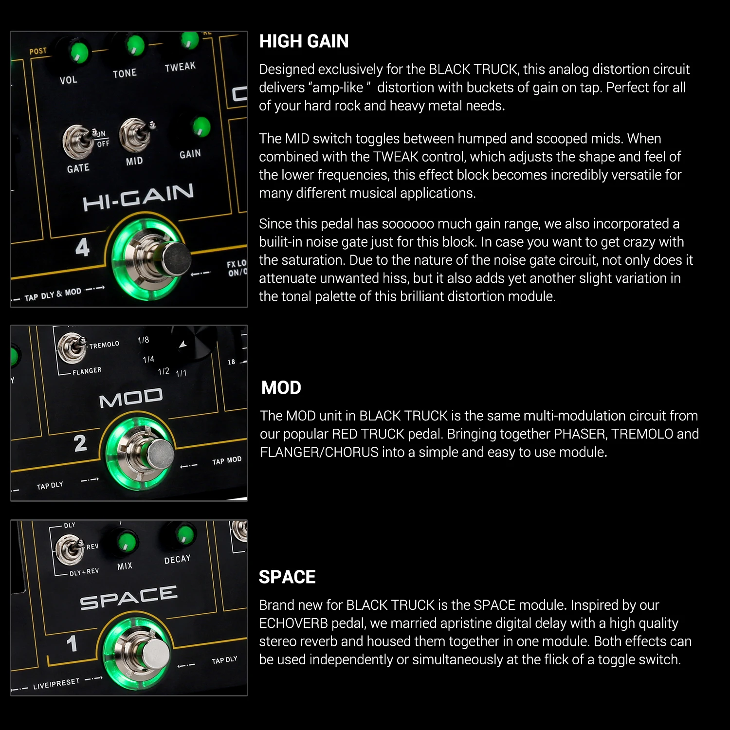 BLACK TRUCK сочетает в себе 6 индивидуальных эффектов педалей, высокоточный тюнер, петлю эффектов и переключатель петли. Объединяя их в единое портативное устройство, которое построено для дороги. Специально для этого продукта был разработан новый аналоговый «amp like» с высоким коэффициентом усиления, который охватывает огромный спектр тональных возможностей и широкий спектр усиления. Аналоговые модули BLACK TRUCK хорошо дополняются мульти-модуляционной педалью и цифровым двигателем ambience, просто называемым пространством, которое состоит из высококачественной цифровой задержки и стереозвука. Черный грузовик специально разработан для хард-рок и тяжелых металлов-музыкантов.