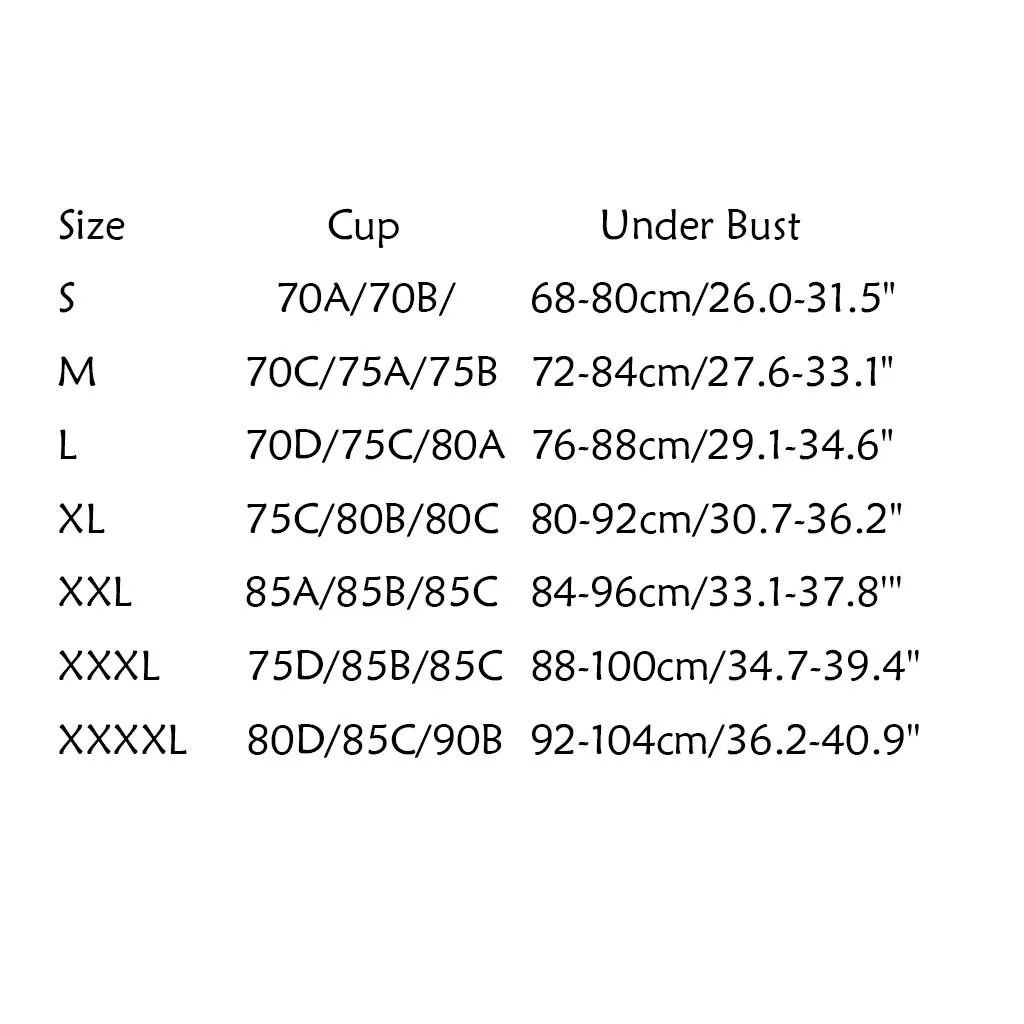 Размеры Чашка Обхват под грудью S 70A/70B/ 68-80 см/26,0-31,5" М 70C/75A/75B 72-84 см/27,6-33,1" L 70D/75C/80A 76-88 см/29,1-34,6" XL 75C/80B/80C 80-92 см/30,7-36,2" XXL 85A/85B/85C 84-96 см/33,1-37,8 ''' XХХL 75D/85B/85C 88-100 см/34,7-39,4'' XXXXL 80D/85C/90B 92-104 см/36,2-40,9''