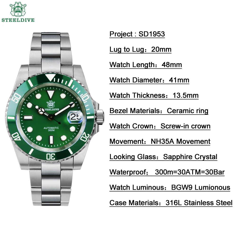 Механические Автоматические часы STEELDIVE 1953, мужские часы 41 мм с сапфировым кристаллом NH35A, механические наручные часы, светящиеся часы BGW9