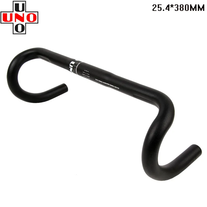 UNO CR21 6061AL road bike super lightweight aluminum alloy racing bends Handlebar Brand: UNO Material: 6061 AL Origin: mainland China Caliber: 25.4mm (intermediate installation caliber) Width: 380mm.400mm.420mm.440mm (distance from middle to middle) Color: matte black. Weight: 380mm(348g) 400mm(355g) 420mm(363g) 440mm(373g). Parameter :R value 70mm. D value 120MM. Features: aluminum alloy material!High strength!Coating simple atmosphere!It's a good choice for refitting and upgrading!