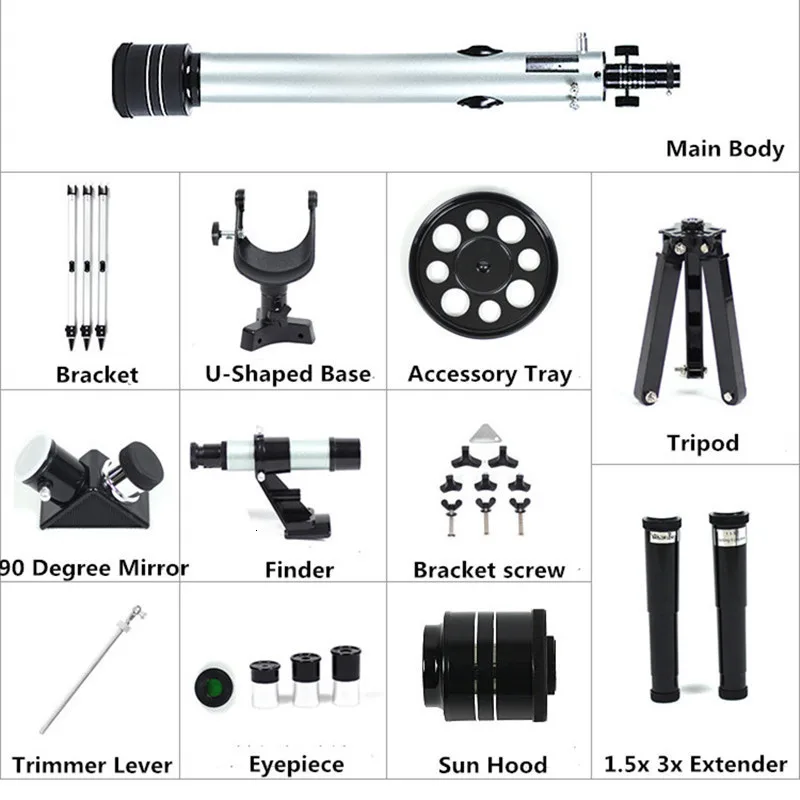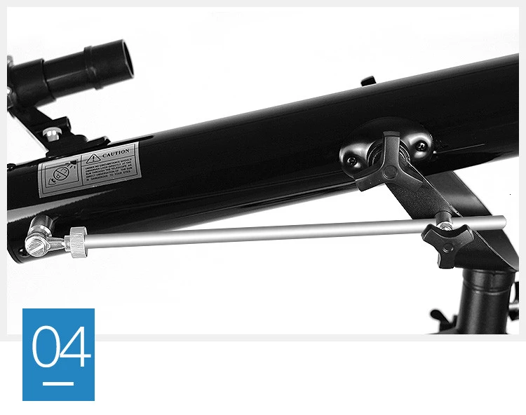 -Артикул: F90060-Диафрагма: 60 мм (прибл. 2,36 дюйма)-Фокусное расстояние: 900 мм-Косое зеркало: 90 градусов-Регулируемый штатив из алюминиевого сплава-Самая Высота: 125 см-Прицел телескопа: 5x24