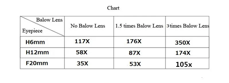 Окуляр f12мм только = 700/12 = 58 раз. Совместим с 3-кратными линзами Balow = 58*3 = 174 раз. Подходит для 1,5 раз эректора = 58*1,5 = 87 раз эрекционного изображения. (Подходит для просмотра на большом расстоянии).