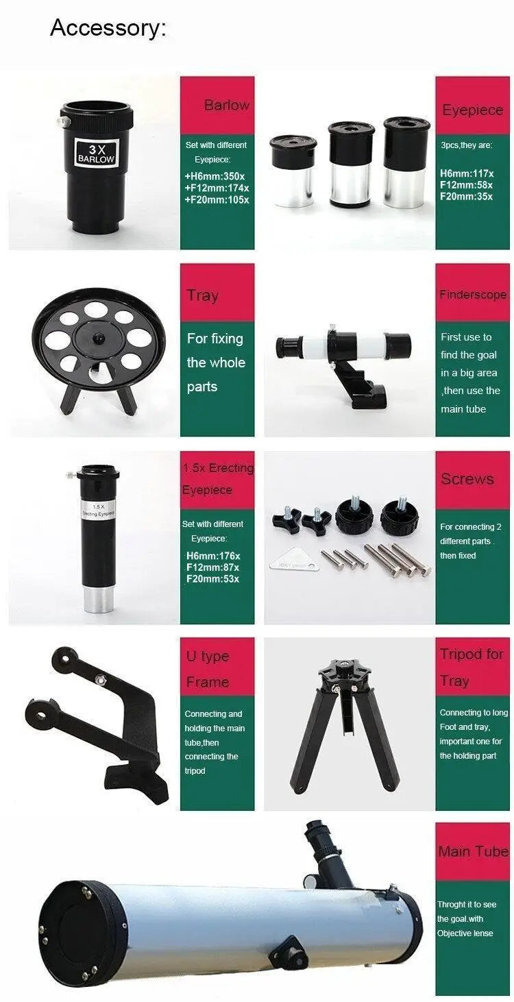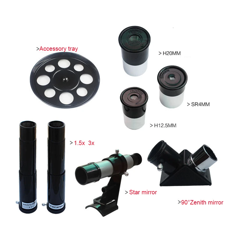 Стандартный 0,965 дюймовый аксессуар включает в себя:-Окуляр: sr4мм (подходит для астрономического наблюдения)H12,5 мм (подходит для дальнего обзора)H20 мм (подходит для осмотра достопримечательностей)-Объектив 3X Balow-1,5x Монтажная линзаМаксимальное количество кратных: 675 раз-получите возможность четко видеть кольцевой остров на луне!О кратных:-Комплектуется окуляром: SR4mm,H12.5mm, H20mm, кратные являются 900/4 = 225X, 900/12.5 = 72X,900/20 = 45X-При комбинированном выборе 3X линзы Барлоу кратные составляют 225x3 = 675X, 72x3 = 216X,45x3 = 135X-Плюс 1,5x положительная линза снова, кратные 225x1,5 = 337X, 72x1,5 = 108X,45x1,5 = 67XФормула:-Фокусное расстояние объектива/фокусное расстояние окуляра x мультипликатор Барлоу = максимальное увеличение-Фокусное расстояние объектива/фокусное расстояние окуляра = увеличениеИнформация о конфигурации:-Лунный фильтр: поскольку много отраженсветильник мешает нашему наблюдению за полнолунием, поэтому мы можем использовать лунный фильтр, чтобы избежать помех, И тогда поверхность Луны будет видна более четко.-Вкрутите лунный фильтр в резьбу окуляра в нижнюю часть объектива, а затем подключите окуляр к объективу zenith.Примечание:1. Функция ночного видения означает, что телескоп работает лучше в условиях сласветильник щения, чем обычные телескопы, но он не работает в полной темноте. Если вы возражаете, пожалуйста, не покупайте.2. Основная функция водонепроницаемости означает, что телескоп может справиться с небольшими каплями дождя или капель воды, но он будет испорчен при массивных условиях воды.Внимание:Никогда не пытайтесь наблюдать за солнцем прямо через телескоп, это серьезно повредит вашим глазам!