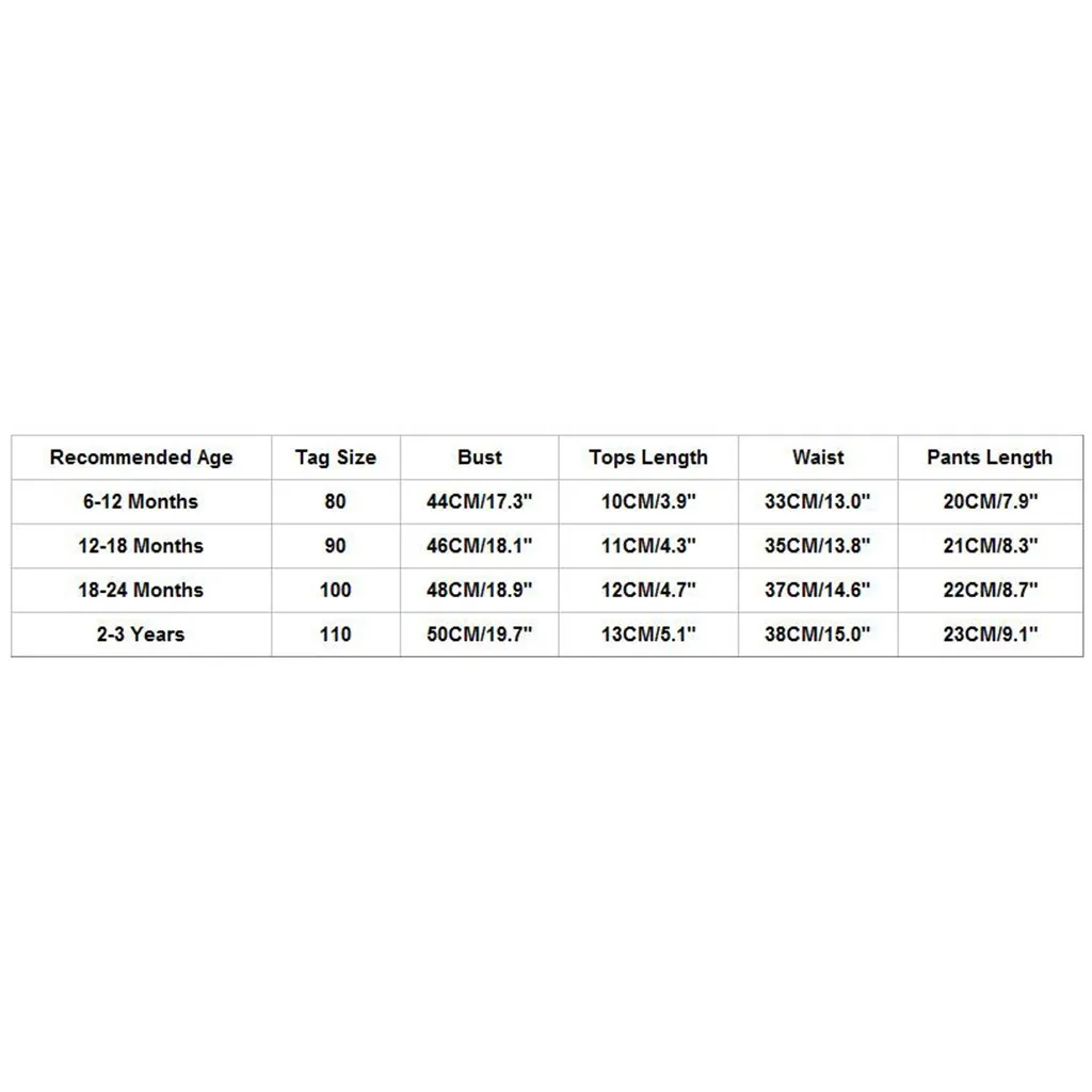 Рекомендуемый возраст Тег Размеры Обхват груди Топы Длина Обхват талии Брюки Длина 6-12 месяцев 80 44 см/17,3" Высота каблука 10 см/3,9" 33 см/13,0" 20 см/7,9" 12-18 месяцев 90 46 см/18,1" 11 см/4,3" 35 см/13,8" 21 см/8,3" 18-24 месяцев 100 48 см/18,9" 12 см/4,7" 37 см/14,6" 22 см/8,7" От 2 до 3 лет 110 50 см/19,7" 13 см/5,1" 38 см/15,0" 23 см/9,1"