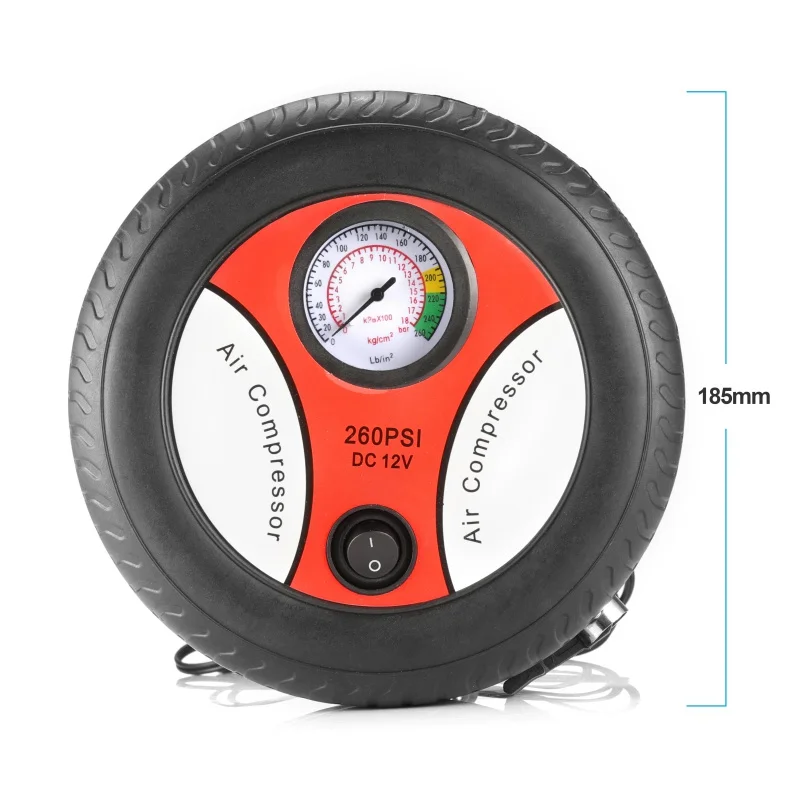 Особенности: 260PSI, надувает обычную автомобильную шинку около 5 минут (>30psi). Питание от прикуривателя/постоянного тока 12 В, после нажатия на выключатель, оно будет работать автоматически с низким уровнем шума. Компактный и портативный, простой в использовании. Обеспечить датчик давления и 3 адаптера сопла. Идеально подходит для накачивания шин, шариков, резиновых поплавков, ховеркрафта и т. д. Технические характеристики: Фунтов/кв. дюйм: 260 Напряжение: DC12V Мощность: 120 ~ 150 Вт Материал: металл, пластик Длина воздушной трубки: 50 см/19,7 дюйма Диаметр изделия: 17,5 см Высота изделия: 6,5 см Посылка включает в себя: 1 х воздушный компрессор