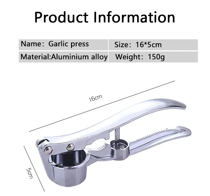 Название продукта: многофункциональный пресс для чеснока Материал: алюминиевый сплав Размер: 16*5 см Вес: 125 г Диапазон применения: чеснок, имбирь и другие фрукты и овощи
