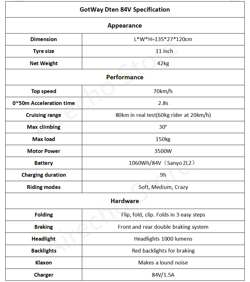 Двигатель: 84 V 3500 W одноприводный двигатель Литиевая батарея: Sanyo ZL2 Количество разряда: 1060Wh N. W. : 42 кг Время зарядки (поддержка двойного порта зарядки): 9 H Максимальная скорость: 70 км/ч Диапазон (ECO): 80 км (60 кг всадника при 20 км/ч) Наклон: 30 градусов Размер шин: 11 дюймов Вес нагрузки: 150 кг
