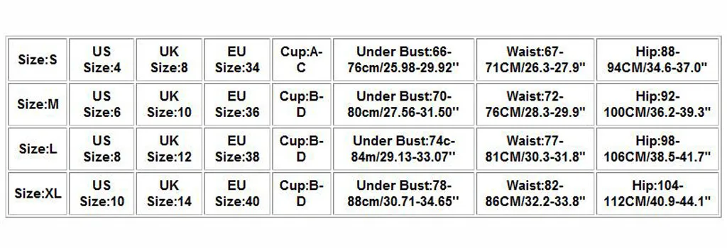Размеры Нам Размеры UK Размеры ЕС Размеры Чашка Обхват под грудью Обхват талии Обхват бедер S 4 8 34 A-C 66-76 см/25,98-29,92'' 67-71 см/26,3-27,9" 88-94 см/34,6-37,0" М 6 10 36 B-D 70-80 см/27,56-31,50'' 72-76 см/28,3-29,9" 92-100 см/36,2-39,3" L 8 12 38 B-D 74c-84m/29,13-33,07'' 77-81 см/30,3-31,8" 98-106 см/38,5-41,7" XL 10 14 40 B-D 78-88 см/30,71-34,65'' 82-86 см/32,2-33,8" 104-112 см/40,9-44,1"
