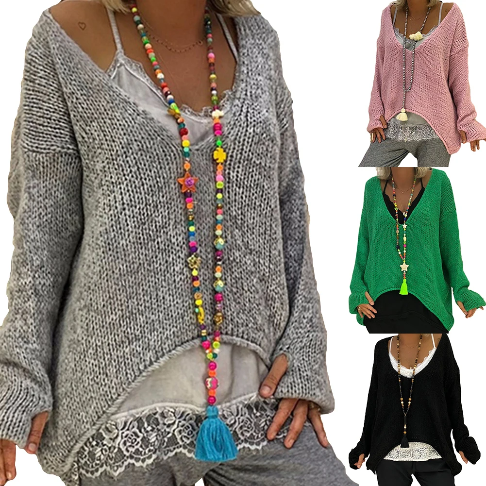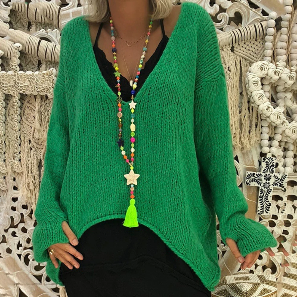 Свободный женский свитер размера плюс, осенне-зимняя верхняя одежда, свитера, Одноцветный свитер с v-образным вырезом и длинным рукавом, ассиметричный вязаный свитер