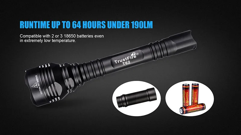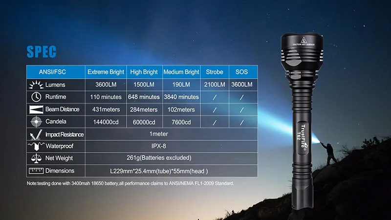 Этот тактический перезаряжаемый фонарик поддерживает сверхдолгий режим ожидания, режим turbo при 3600 люмен работает 110 минут, высокий режим при 1500 люмен работает 648 минут, средний режим при 190 люмен работает 64 часа, протестировано с использованием аккумуляторов 18650 3400 мАч.