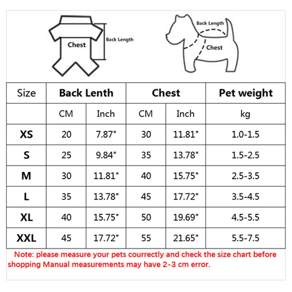* Ручные измерения могут иметь погрешность в 1-2 см * Пожалуйста, выберите больший размер, если ваш питомец ворвется быстро Или между 2 размерами * Для одежды с двумя ножками, пожалуйста, обратите внимание на Обхват груди, и для четырех ног, должен подходить для груди Обхват и длина спины.