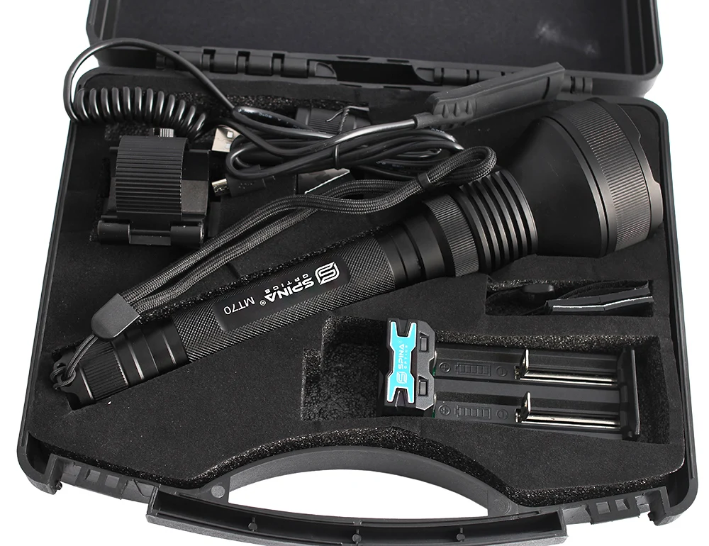 T70-это двойные переключатели с дальностью действия 1 км. Он питается от 2*18650 батарей с 4 уровнями яркости и стробоскопом, он проектирует с большим рефлектором, боковой переключатель для изменения яркости, водонепроницаемый достичь IPX8 и прошел 1 метровый тест на падение.