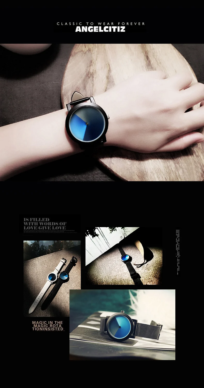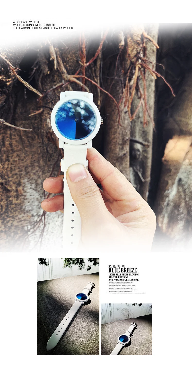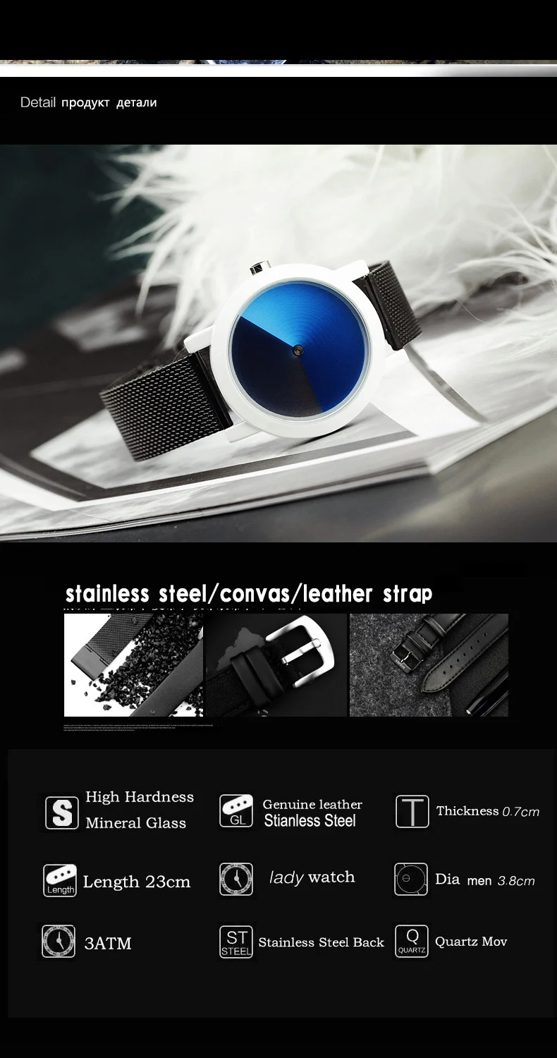 Пожалуйста, посмотрите подробную информацию, как показано ниже * Чехол для часов: сплав с тонким покрытием (черный, серебристый, белый) * Ремешок для часов: ремешок из натуральной кожи или трикотажный материал из нержавеющей стали * 30 метров водонепроницаемый, отвечает требованиям повседневной жизни • Общая длина: 23 см Диаметр 3,8 см Thickness0.8cm * Для предпочтений молодых людей Креативный дизайн/психоделический синий простой. Лицо маленькое, подходит для девушек и женщин