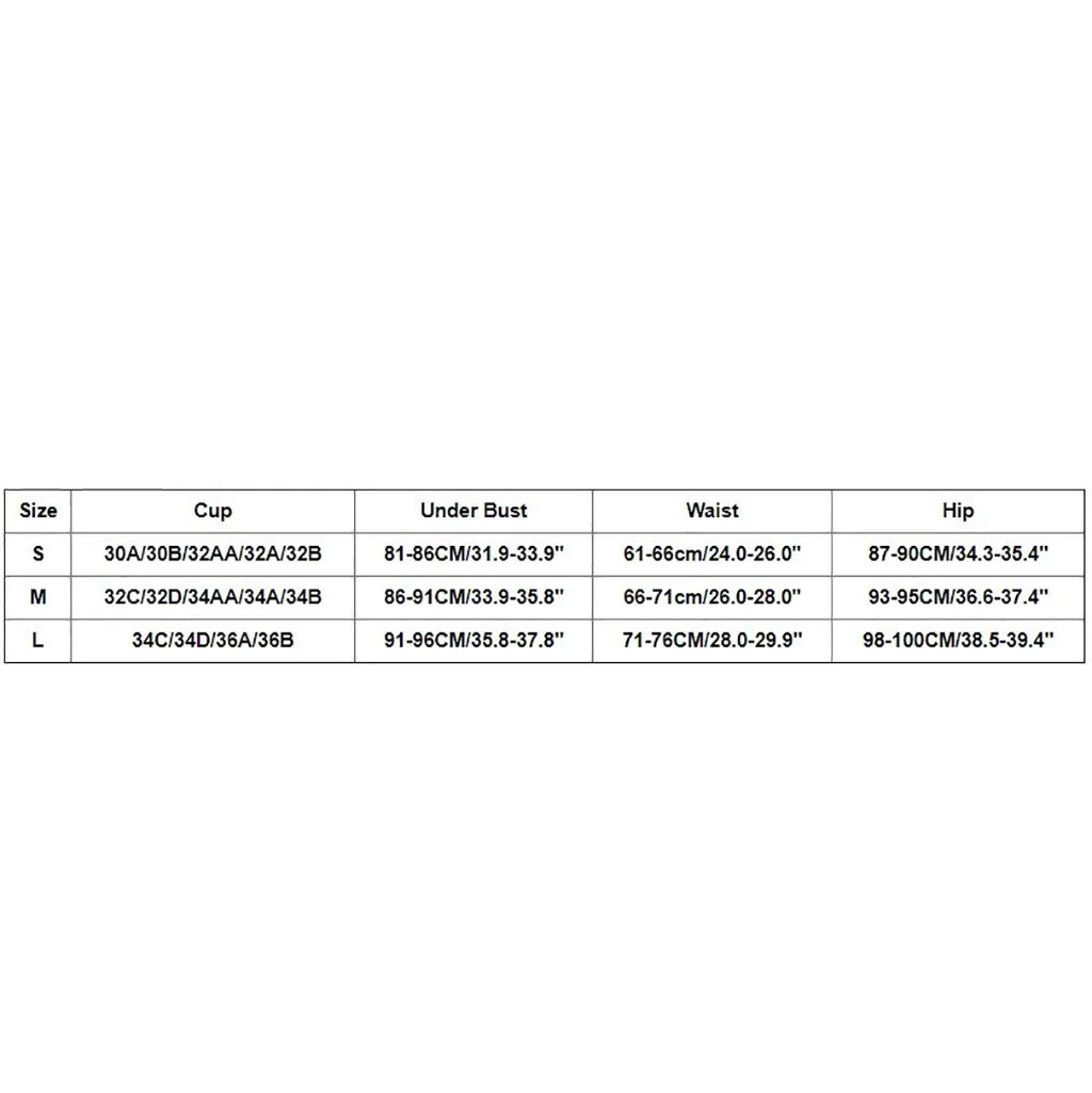 Примечание: Пожалуйста, сравните детали размеров с вашим, прежде чем купить! Используйте аналогичную одежду, чтобы сравнить ее с размером Размеры Чашка Обхват под грудью Обхват талии Обхват бедер S 30A/30B/32AA/32A/32B 81-86 см/31,9-33,9" 61-66 см/24,0-26,0" 87-90 см/34,3-35,4" М 32C/32D/34AA/34A/34B 86-91 см/33,9-35,8" 66-71 см/26,0-28,0" 93-95 см/36,6-37,4" L 34C/34D/36A/36B 91-96 см/35,8-37,8" 71-76 см/28,0-29,9" 98-100 см/38,5-39,4"