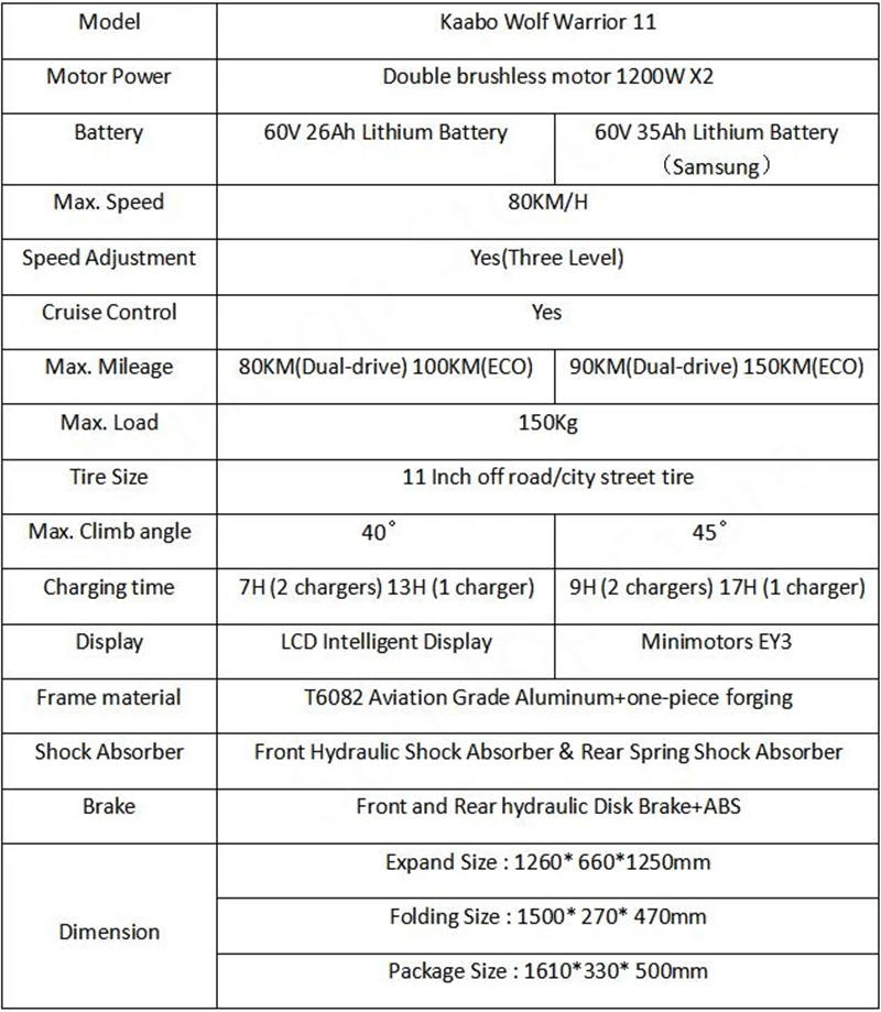 Спецификация Kickscooter Kaabo Wolf Warrior II: