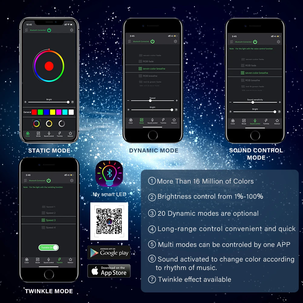 Режим изменения режима дистанционного управления: static13 цвет (красный, зеленый, синий, желтый, Mixd белый, чистый белый, голубой, фиолетовый + 5 цветов DIY) и RGB светильник изменения выцветания, скачка, искра и регулировка яркости или скорости режимаМетеоритный эффект: каждый раз, когда вы нажимаете клавишу, Метеор появляется один раз. Если вы не нажимаете клавишу, Метеор пересечет один раз в минуту. Пожалуйста, оставьте сообщение, если вам нужно установить метеорит в зависимости от времени по вашему запросу.