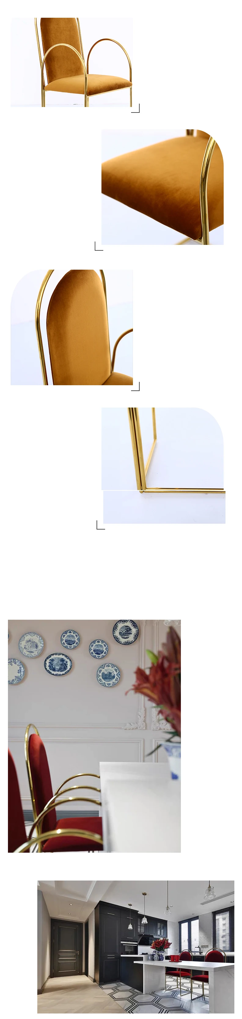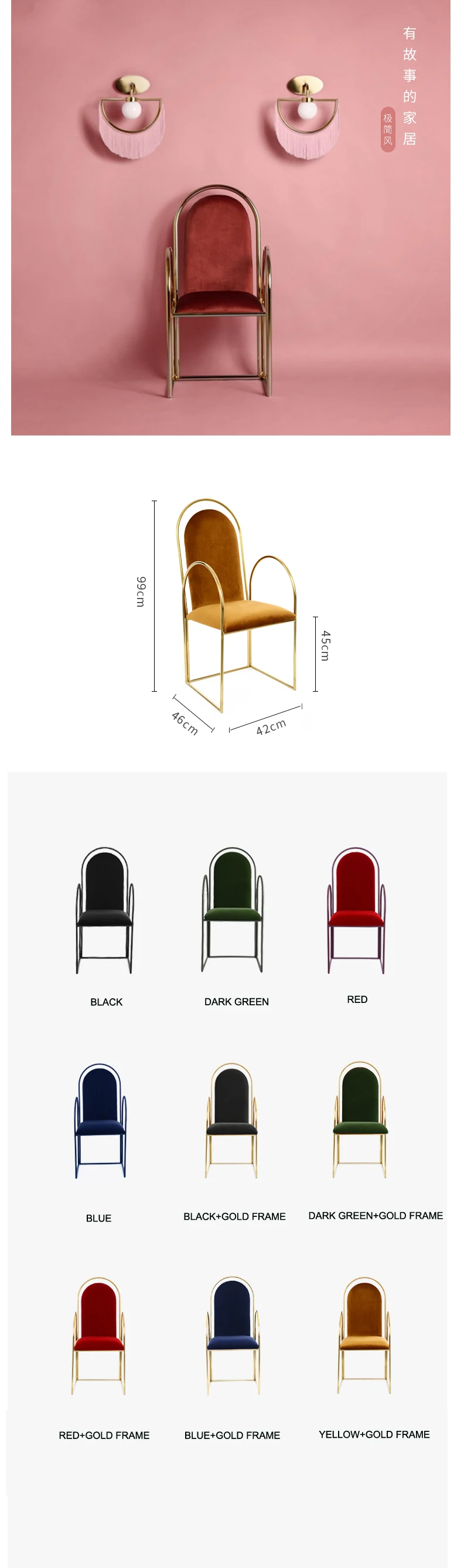 Хороший классический дизайн скандинавский новый золотой цвет мягкий чехол подушка бархатная ткань модный макияж обеденный стул со спинкой 1 шт Оправа может быть золотой, черный, зеленый и красный Ткань может быть зеленой, красной, желтой, синей Если вы хотите другой цвет, пожалуйста, свяжитесь с нами Красивый дизайнерский стул для вашего современного дома Вам понравится.