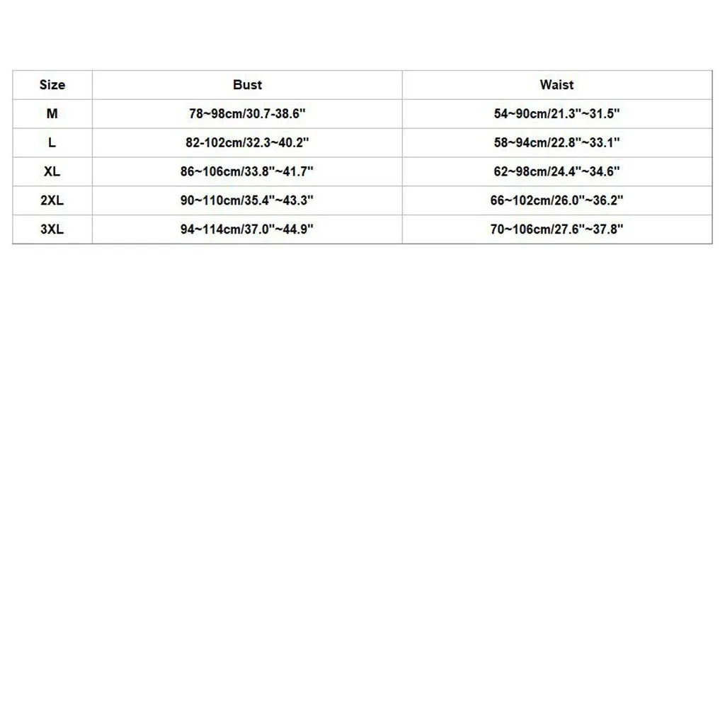 Информация о продукте:Размеры Обхват груди Обхват талии М 78 ~ 98 см/30,7-38,6" 54 ~ 90 см/21,3 "~ 31,5" L 82-102 см/32,3 ~ 40,2" 58 ~ 94 см/22,8 "~ 33,1" XL 86 ~ 106 см/33,8 "~ 41,7" 62 ~ 98 см/24,4 "~ 34,6" 2XL 90 ~ 110 см/35,4 "~ 43,3" 66 ~ 102 см/26,0 "~ 36,2" 3XL 94 ~ 114 см/37,0 "~ 44,9" 70 ~ 106 см/27,6 "~ 37,8"