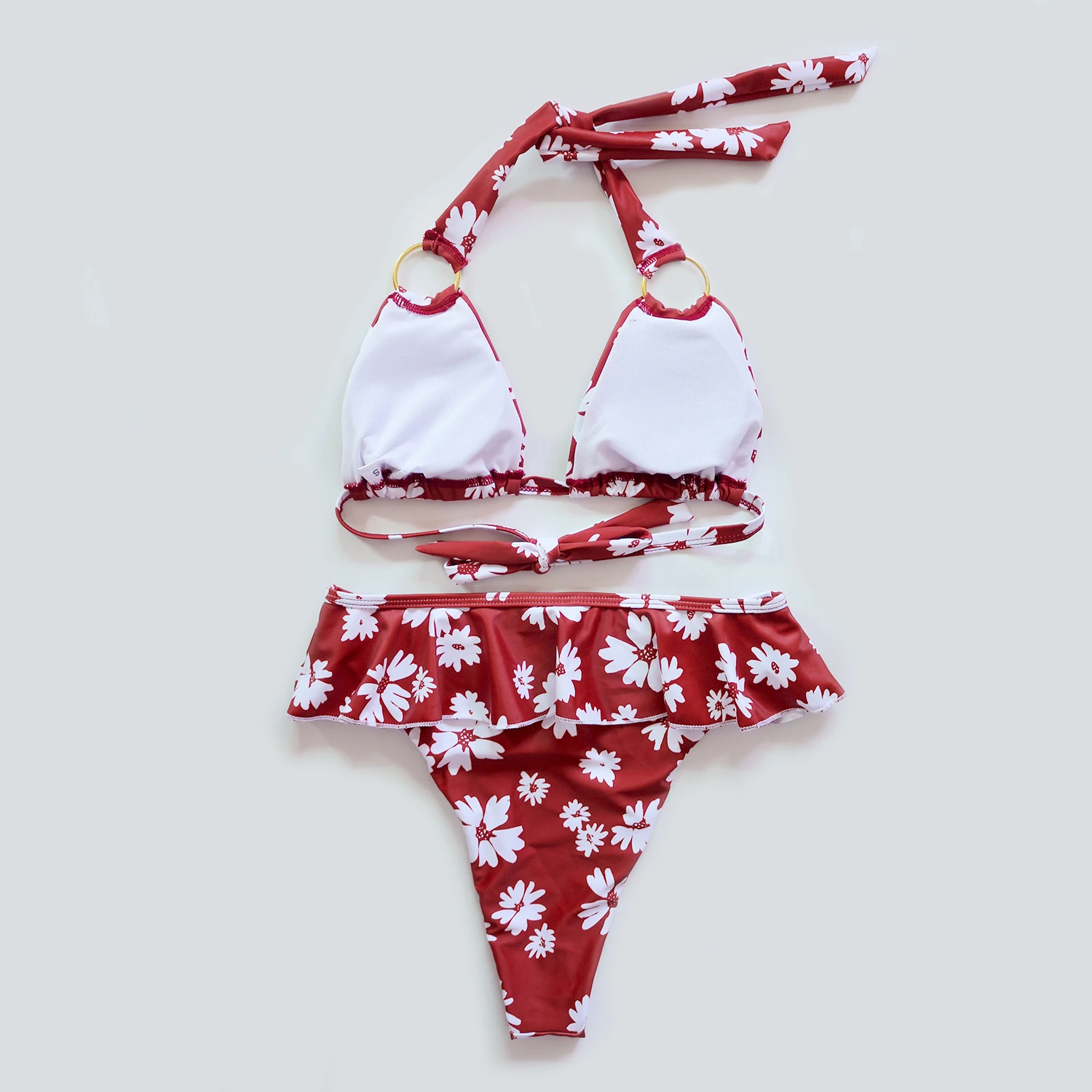 Сексуальный красный белый цветочный бикини с высокой талией и оборками 2021, женский купальник с бретелькой через шею, пляжная одежда, купальный костюм