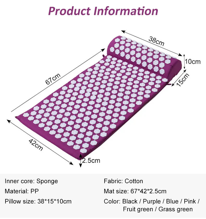 Внутреннее ядро: губка Ткань: хлопок Материал: PP Размер коврика: 67*42*2,5 см Размер подушки: 38*15*10 см Цвет: черный/фиолетовый/синий/розовый/Фруктовый Зеленый/травяной зеленый