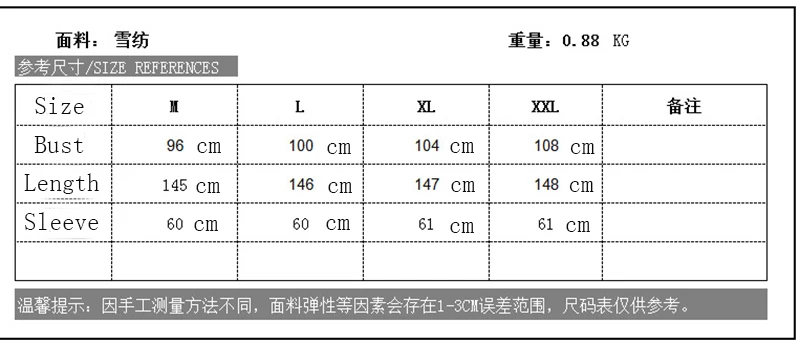 2XL: обхват груди 108 см, обхват талии 108 см, рукав 61 см, длина 148 см