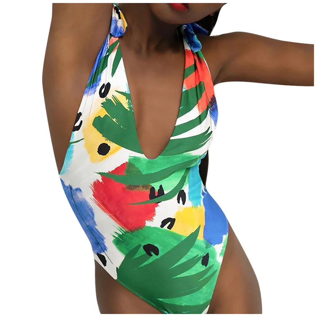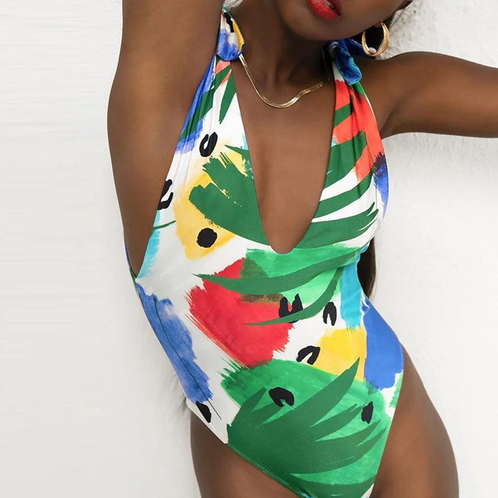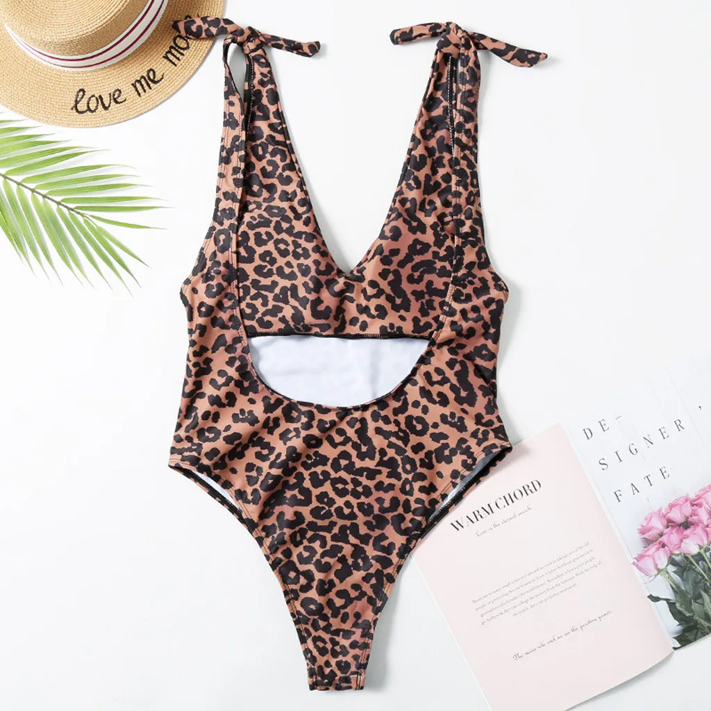 Новый женский модный сексуальный комбинезон с v-образным вырезом и цветочным леопардовым принтом, купальный костюм с открытой спиной, купальный костюм с пуш-ап, купальный костюм с подкладкой, пляжная одежда