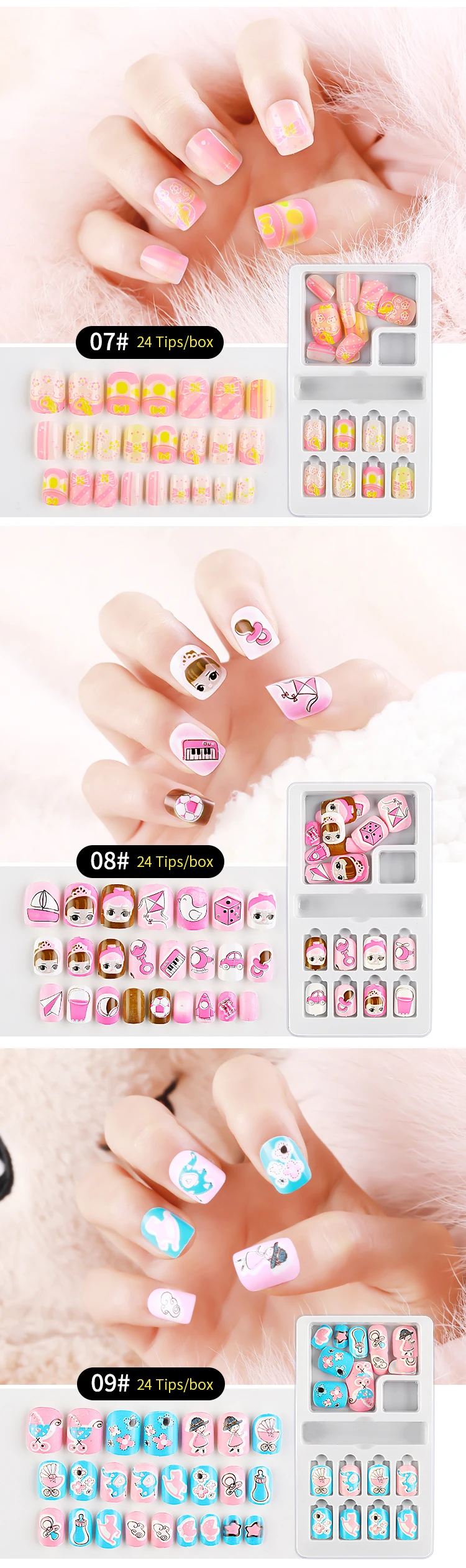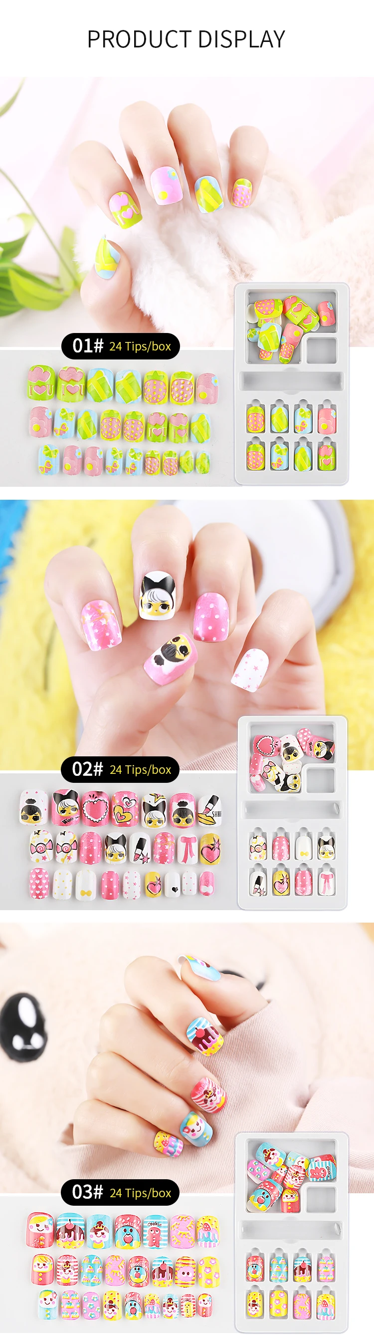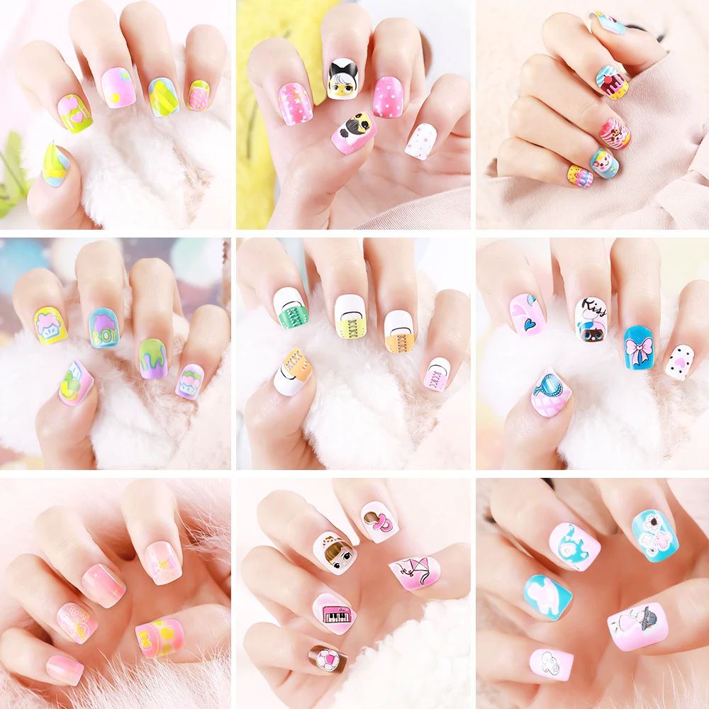 Новинка, 24 шт., накладные ногти с рисунками из мультфильмов, для детей, конфетные накладные ногти, полное покрытие, детские розовые накладные ногти, Маникюр для маленьких девочек