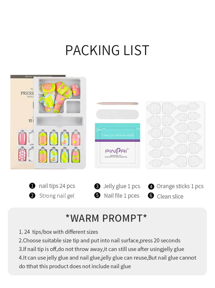 Посылка: 24 накладных кончика для ногтей + 1 лист наклейки для ногтей + 1 пилка для ногтей + 1 Толкатель для ногтей + 1 обертка для удаления ногтей