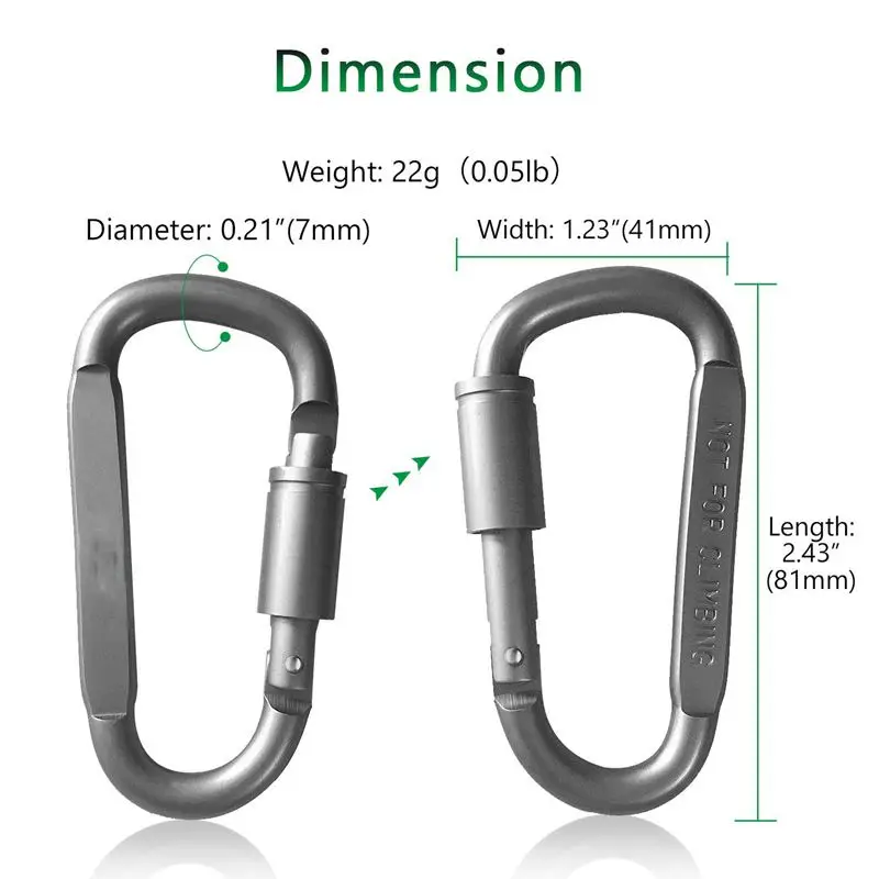 SAFE SCREW MECHANISM: Our 8 cm snap hooks feature a smart locking mechanism that is incredibly safe and practical. Thanks to the improved gate buckle, these D-lock carabiners provide a secure grip and do not let items slip off.