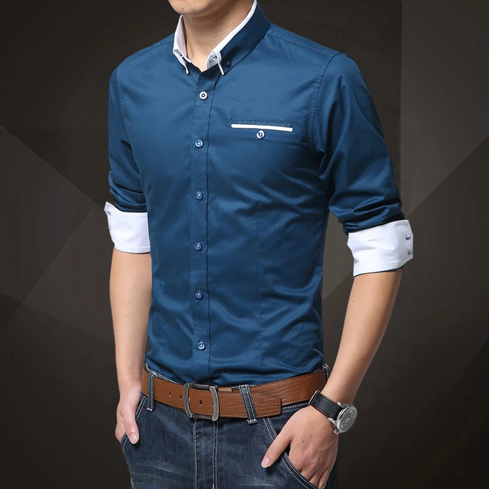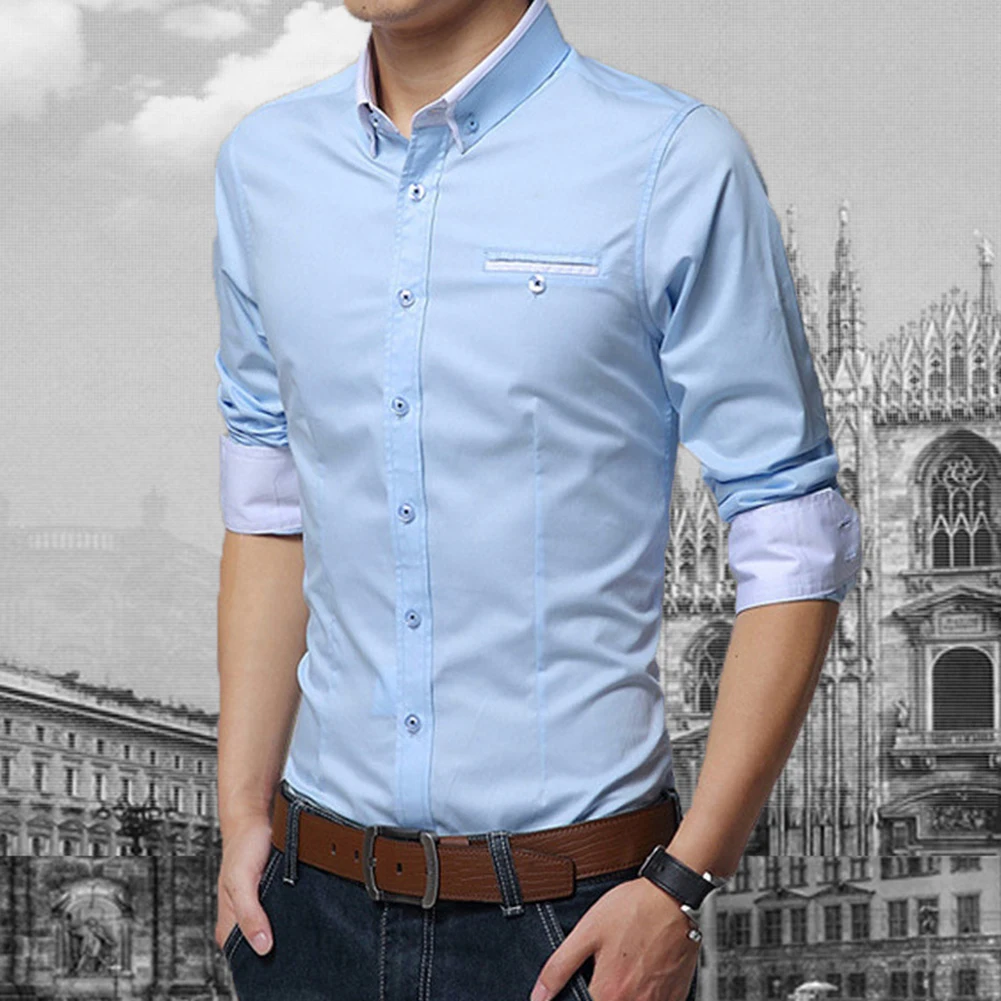 Модная мужская Однотонная рубашка с длинным рукавом и отложным воротником для офиса