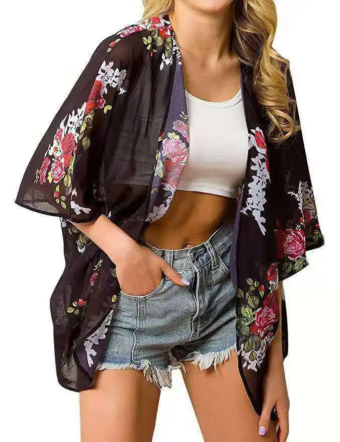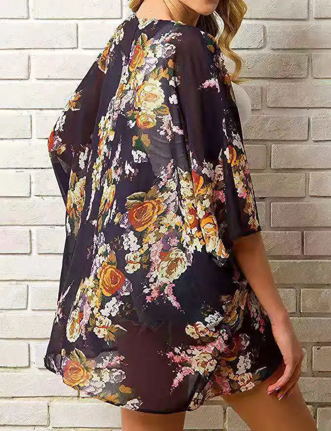 Женский кардиган с короткими рукавами и принтом, шифоновая блузка, однотонная Летняя Пляжная блуза с короткими рукавами