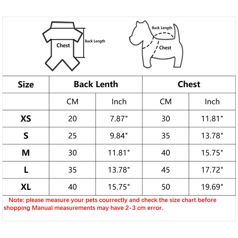 * Ручные измерения могут иметь погрешность в 1-2 см * Пожалуйста, выберите больший размер, если ваш питомец ворвется быстро Или между 2 размерами * Для одежды с двумя ножками, пожалуйста, обратите внимание на Обхват груди, и для четырех ног, должен подходить для груди Обхват и длина спины.