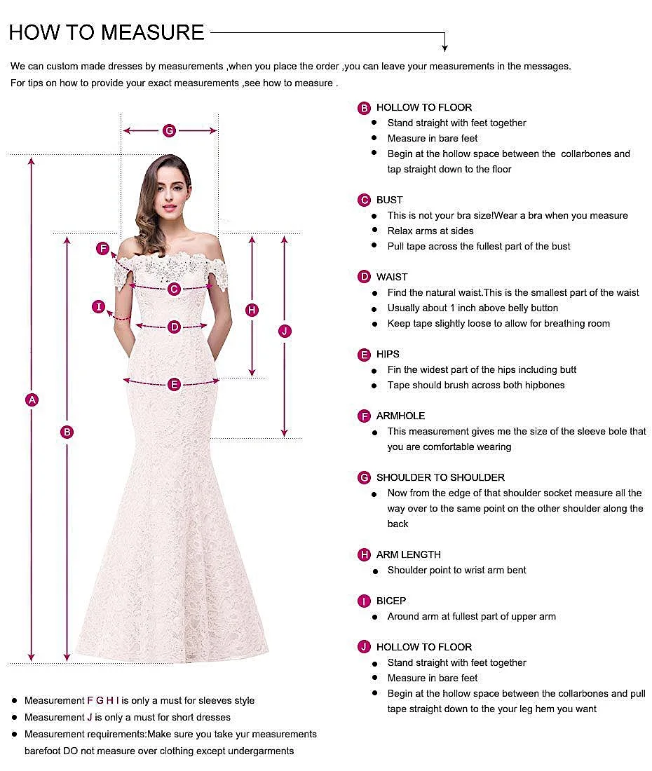 Примечание: Если вам нужно сделать заказ, пожалуйста, выберите любой стандартный размер при заказе, затем напишите ваши измерения в коробке сообщений при оплате в соответствии со следующим методом измерения платья.1) полная грудь = дюймы или сантиметры2) талия =3) Бедра =4) Длина от плеча до плеча =5) Длина от плеча до пола = (от плеча до пола с обувью)6) пройма (пройма) =7) высота = (от верха до пола с обувью)