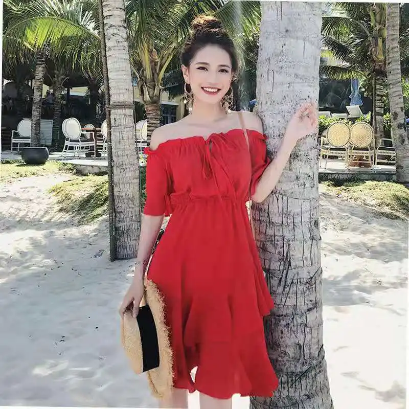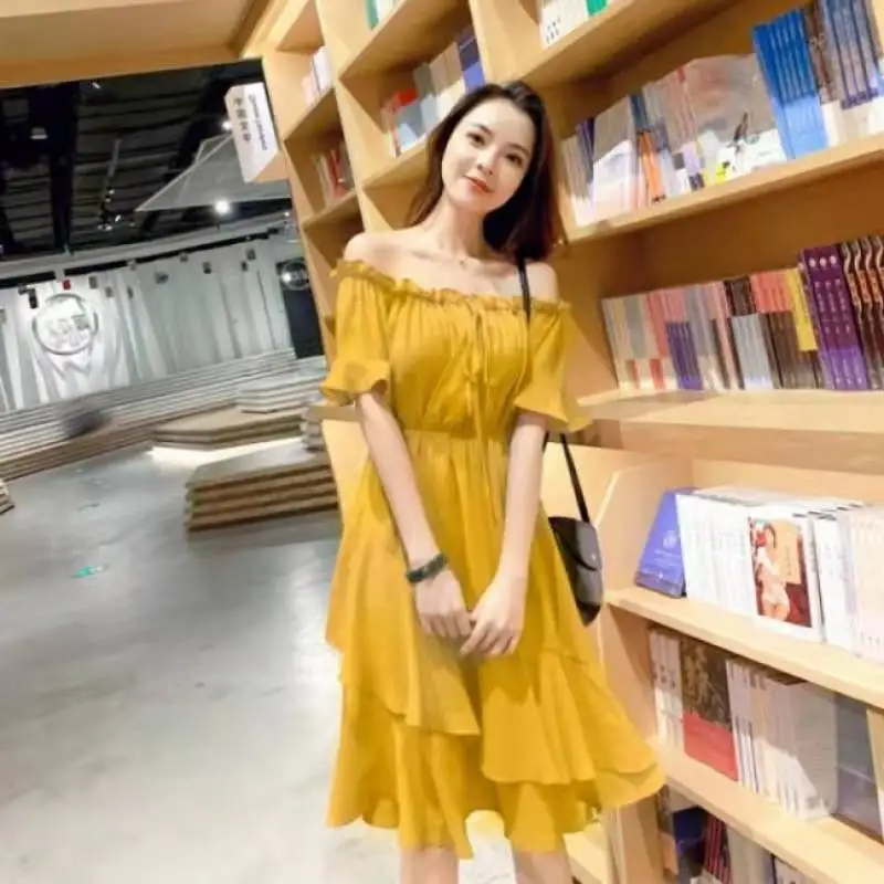 Retro fairy beach skirt summer yellow chiffon seaside vacation word shoulder dress female dress solid color