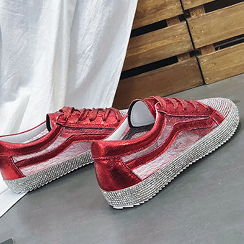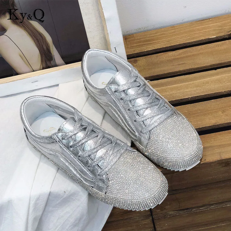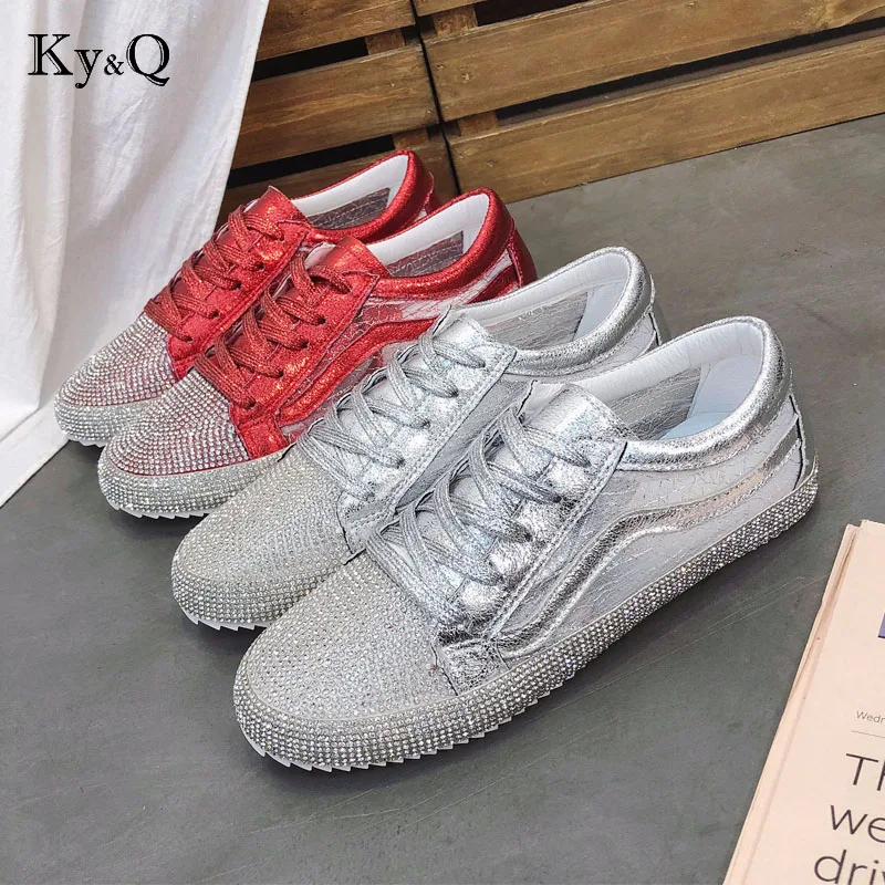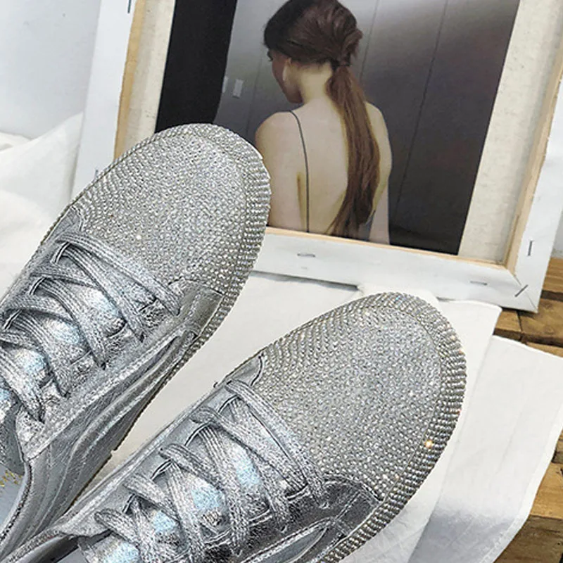 2018 Весенняя модная Женская Блестящая обувь, женские кроссовки, стразы, серебристые, для девушек, украшенные кристаллами, с перекрестной шнуровкой, блестящие, Размеры 35-39