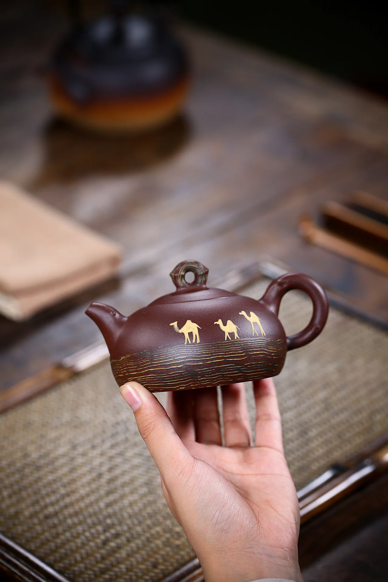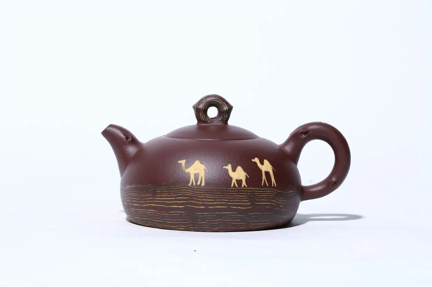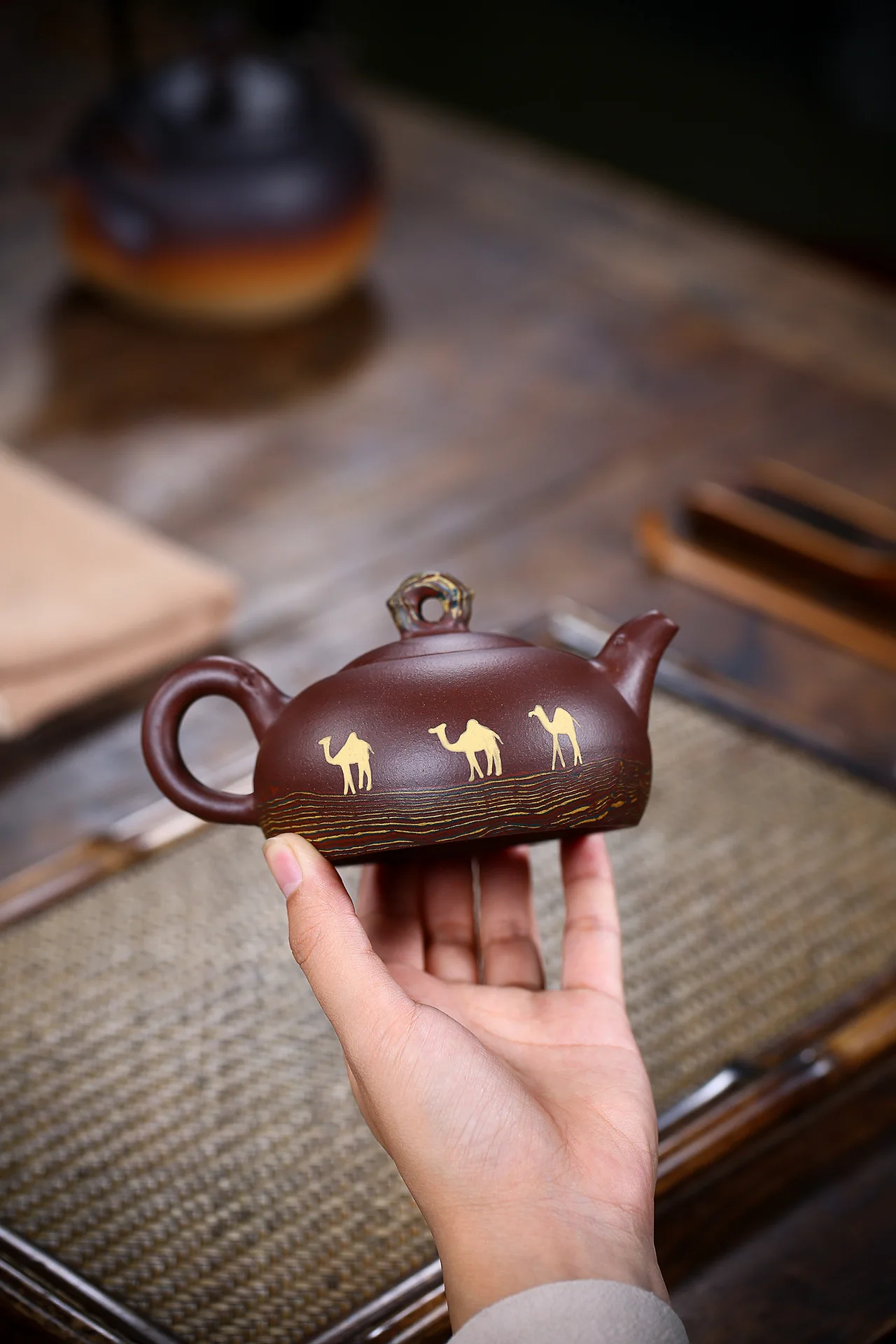 The shape of the pot is smooth, the handle, the spout and the body are lifelike. It's a good pot for collecting and playing. The mud color is simple and elegant. It's used for a long time and gradually shows its edge. It's cultivated quickly and is gentle and solemn. When it's used for tea making, the body of the pot will be warm and the tea soup will be mellow and fragrant.