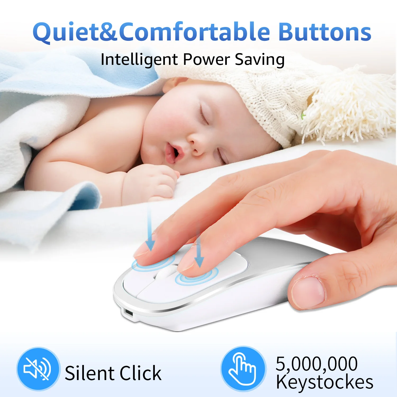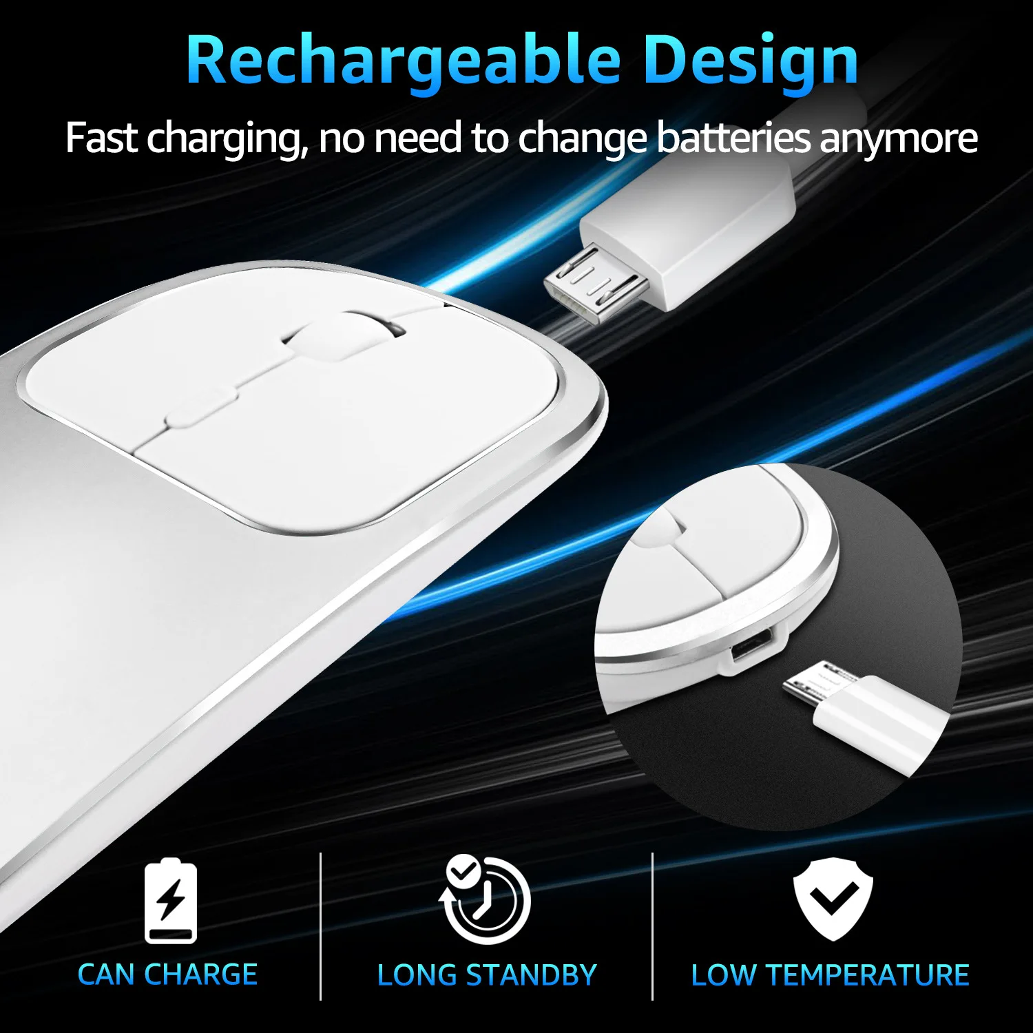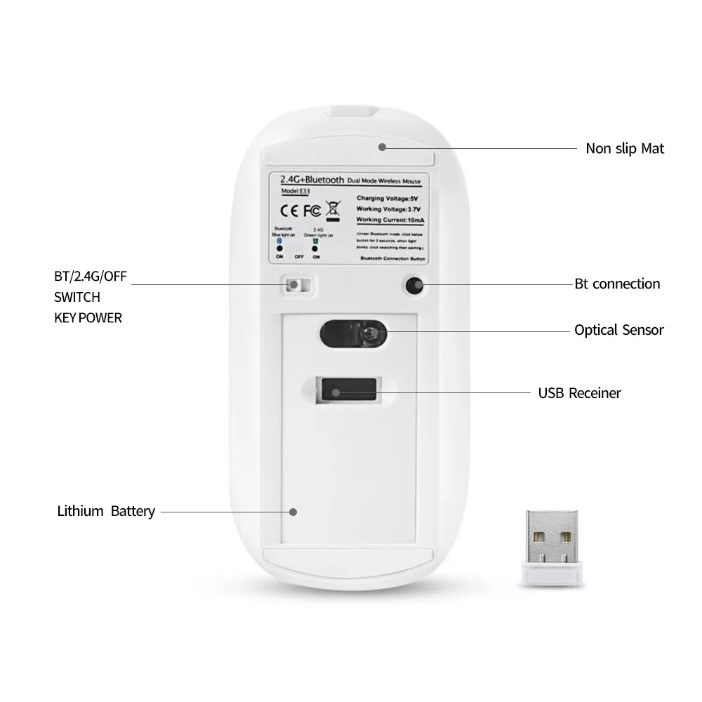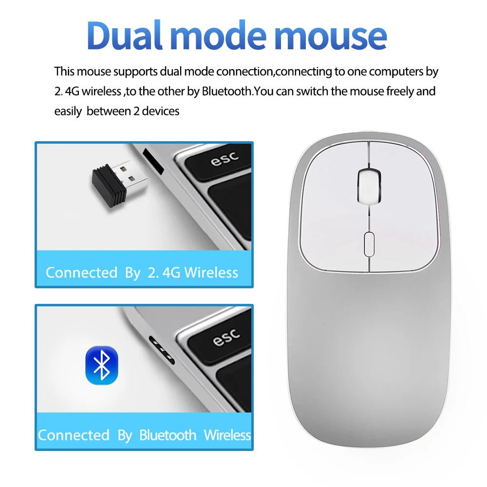 Product parameters: Wireless technology: 2.4G wireless and Bluetooth wireless Wireless distance: 10-15m Product Size: 113 * 57 * 23mm Package size: 11.6cm * 10cm * 3cm Weight: 54 ± 5g Weight after packing: 109g Key number: 4 Resolution: 800/1200 / 1600dpi Operating cycles: 1,000,000 cycles Battery: Built-in 450mAh lithium battery Material: Metal + ABS + Anodizing System requirement: Windows 2000/2003 / ME / XP / Vista / Win7 / 8/10 / MAC OS / Linux product features: RECHARGEABLE WIRELESS MOUSE: Built-in high quality 450mAh lithium rechargeable battery can last up to 500 hours after fully charged. And standby time is super long with auto sleep and wake mode. BLUETOOTH 4.0 and 2.4GHz WIRELESS CONNECTION: With dual mode connection, The Bluetooth / 2.4GHz wireless mouse can work on TWO DEVICES, connecting one device through Bluetooth and the other through 2.4GHz USB Receiver. You could switch the mode between two devices by just switch. With only one mouse, you can switch free to control two devices, from your desktop to your tablet, laptop to Mac, extremely convenient. LUXURY ALLOY MATEIRAL & ANODIZING SURFACE TREATMENT: Very easy to keep this mouse clean due to anodizing on the top, and color never fades in years. PORTABLE & SLIM DESIGN WITH MUTE CLICKS: This comfortable slim ergonomic mouse can be easily carried around anywhere you go with its compact size and light weight. Besides, the quieter clicks can make you concentrate on your work without disturbing others beside you. WIDE COMPABILITY :: Bluetooth mode works with Windows / Android / MAC OS system (Compatible with imac one machine / macbook / macbook air / mac mini, not compatible ipad / iphone). 2.4GHz mode works with laptop, desktop or any device with USB port, simply plug the USB receiver, plug and play. (Note: The USB receiver is stored in the battery compartment of the mouse)