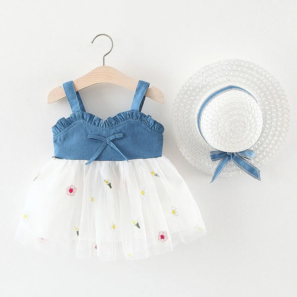 Toddler Baby Kids Girl Sleeveless Strap Bow Flowers Tulle Princess Dresses Hat