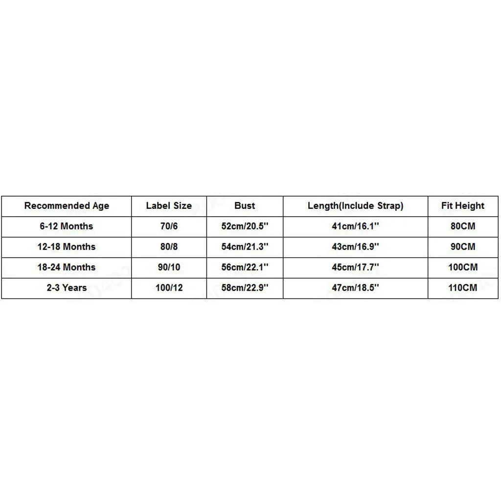 Recommended Age Label Size Bust Length(Include Strap) Fit Height 6-12 Months 70/6 52cm/20.5'' 41cm/16.1'' 80CM 12-18 Months 80/8 54cm/21.3'' 43cm/16.9'' 90CM 18-24 Months 90/10 56cm/22.1'' 45cm/17.7'' 100CM 2-3 Years 100/12 58cm/22.9'' 47cm/18.5'' 110CM