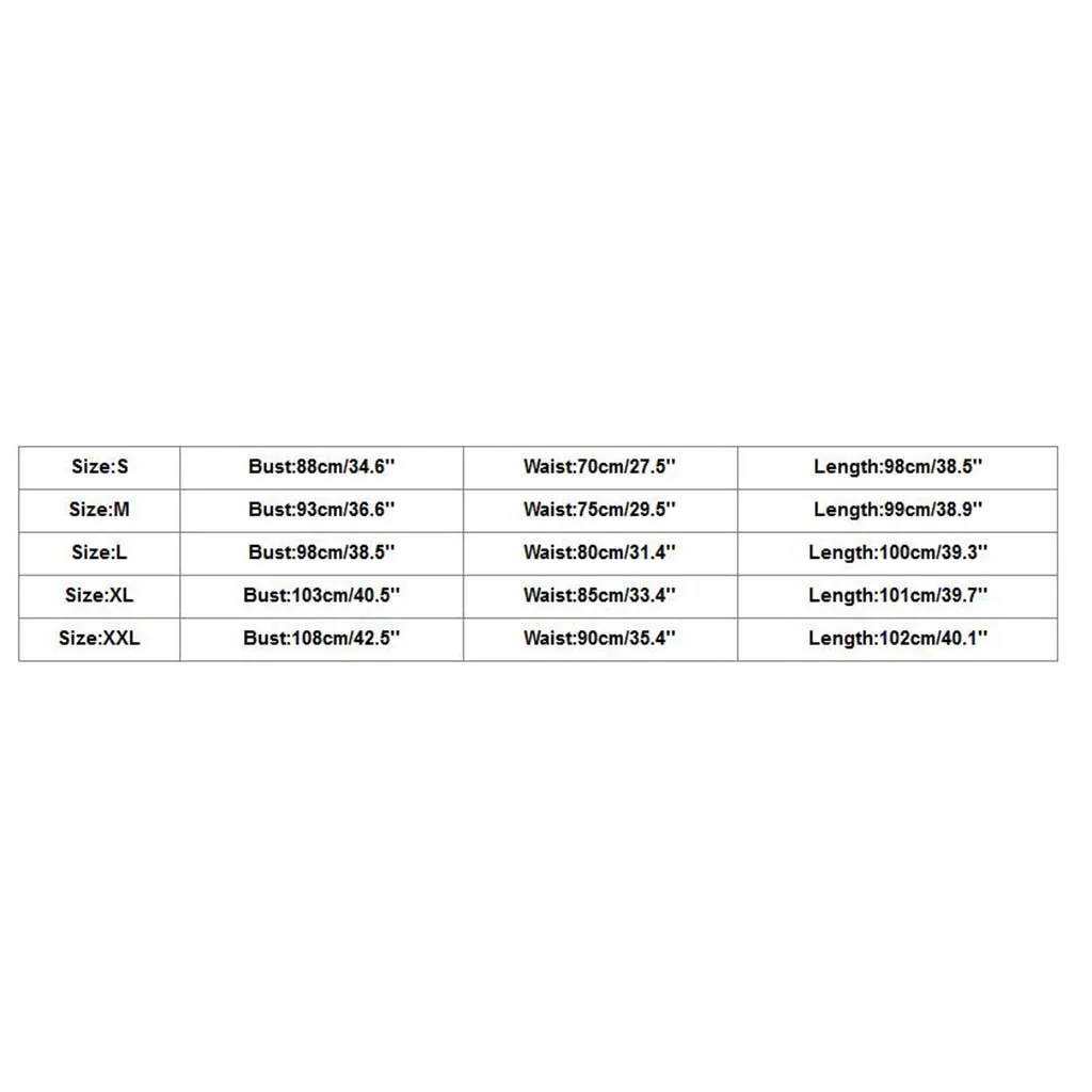 Size Bust Waist Length S 88cm/34.6'' 70cm/27.5'' 98cm/38.5'' M 93cm/36.6'' 75cm/29.5'' 99cm/38.9'' L 98cm/38.5'' 80cm/31.4'' 100cm/39.3'' XL 103cm/40.5'' 85cm/33.4'' 101cm/39.7'' XXL 108cm/42.5'' 90cm/35.4'' 102cm/40.1''