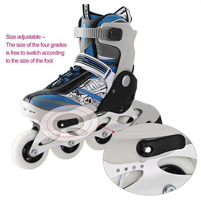 Material: Integral Steel, Plastic 2 Colors: Red, Blue Size: 3 Sizes Size1: 28~31 Size2: 32~35 Size3: 36~39 Type: Inline Skate Quantity: Pair/2Pcs Gender: Unisex Features: Designed for outdoor or indoor use brake on right foot. Be made of high quality material, insure miles of smooth rolling with durability. Easy to adjust sizes in each skate grows as your feet. Warning: Before skating, check that all screws are tightened. Check and clean all screws and nuts for secure fit. Replace brake and ball bearing on a regular basis. Do not modify your inline skates in a way that may endanger your safety. Remove any sharp edges that may appear during skating. Master basic skating rulers before practicing on streets. Stay in control when skating. No towing behind vehicles. Always wear appropriate protective gear(wrist, arm and knee protection). Package Content: 1 x Pair of Inline Skate Note: Due to the difference between different monitors, the picture may not reflect the actual color of the item.