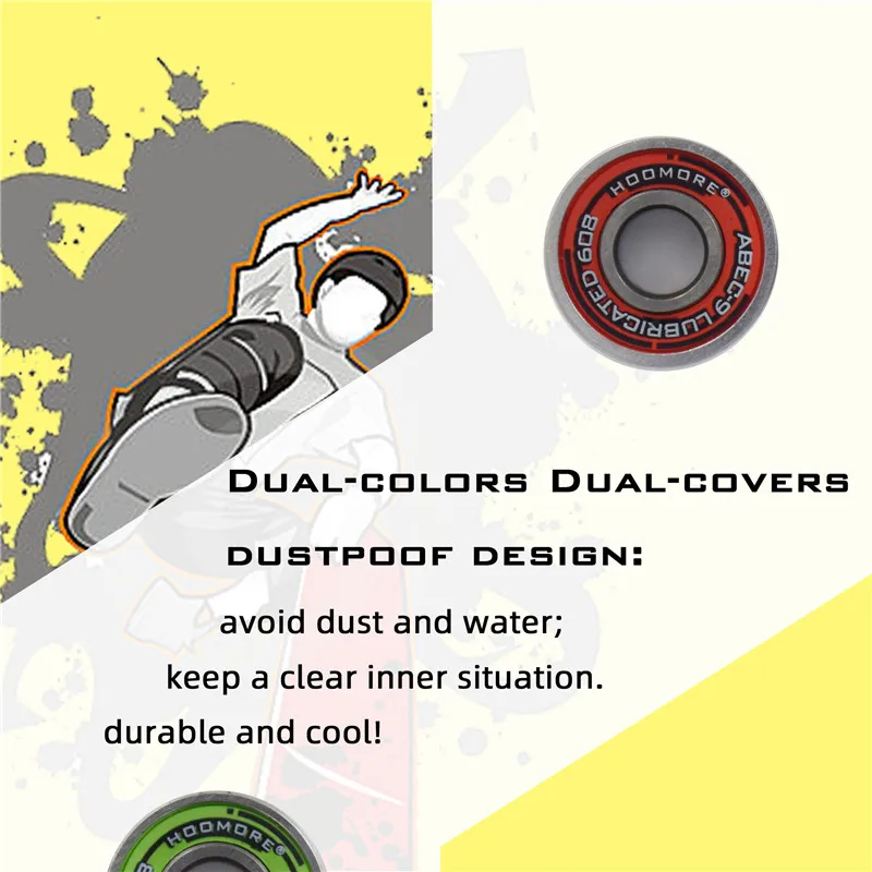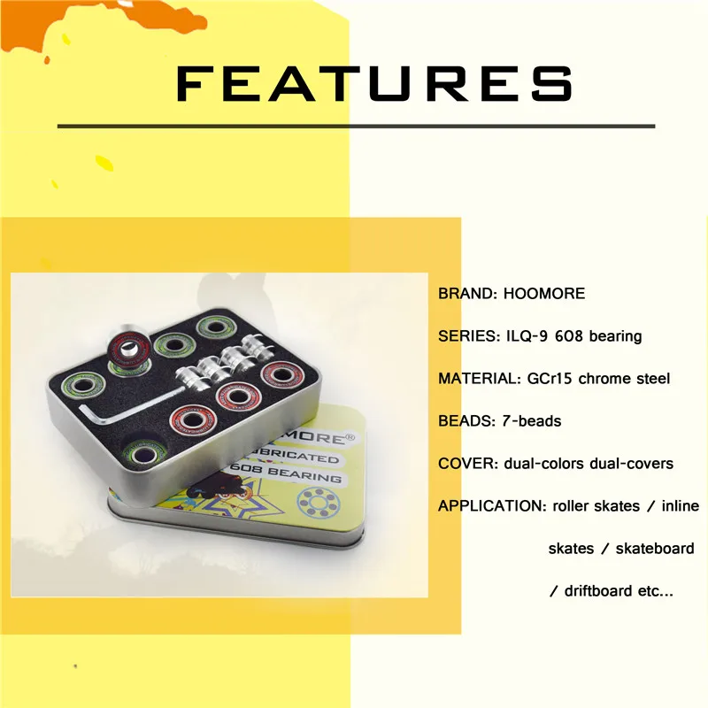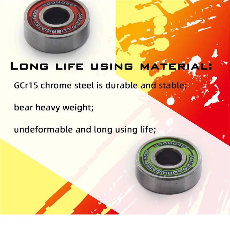 Этот ABEC-9 подшипник является гладким и низким сопротивлением; Его можно использовать на роликовых коньках/скейтборде/скутере и т. д. Размер 608 Стандартный подшипник с размером 8 мм * 22 мм * 7 мм; Двухпылезащитные Чехлы; 7 шариков внутри; Хромированная сталь, никогда не ржавела.