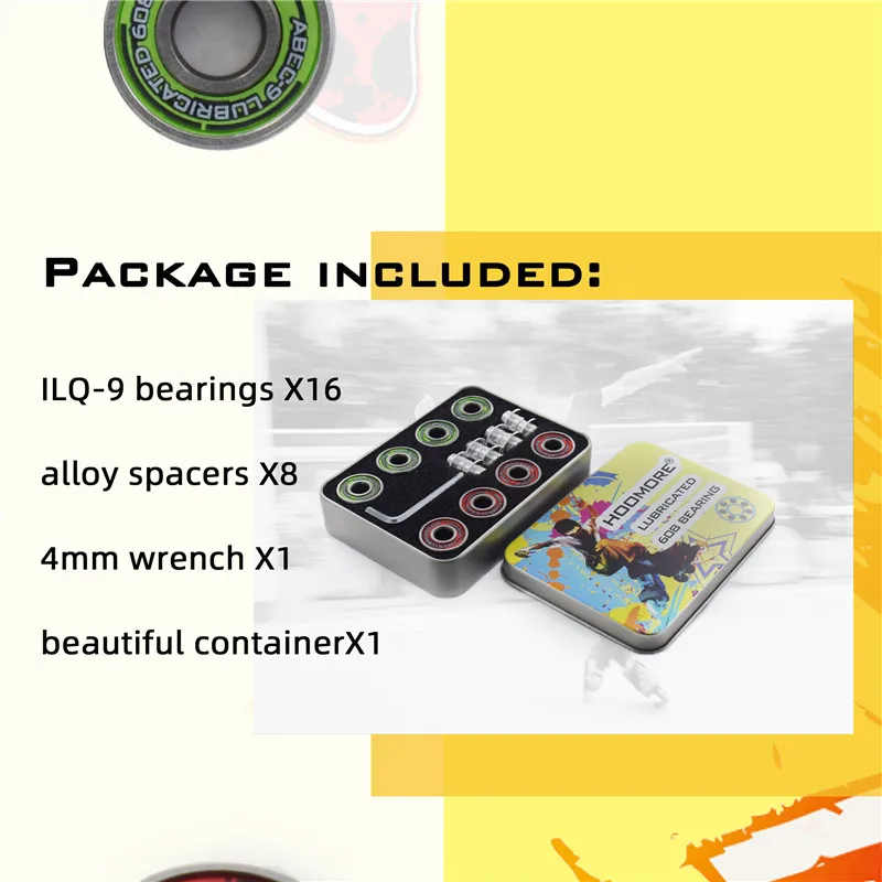 16 шт. abec-9 подшипников; 8 разделителей; 1 гаечный ключ; 1 шт. Красивая железная коробка.