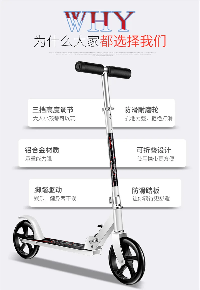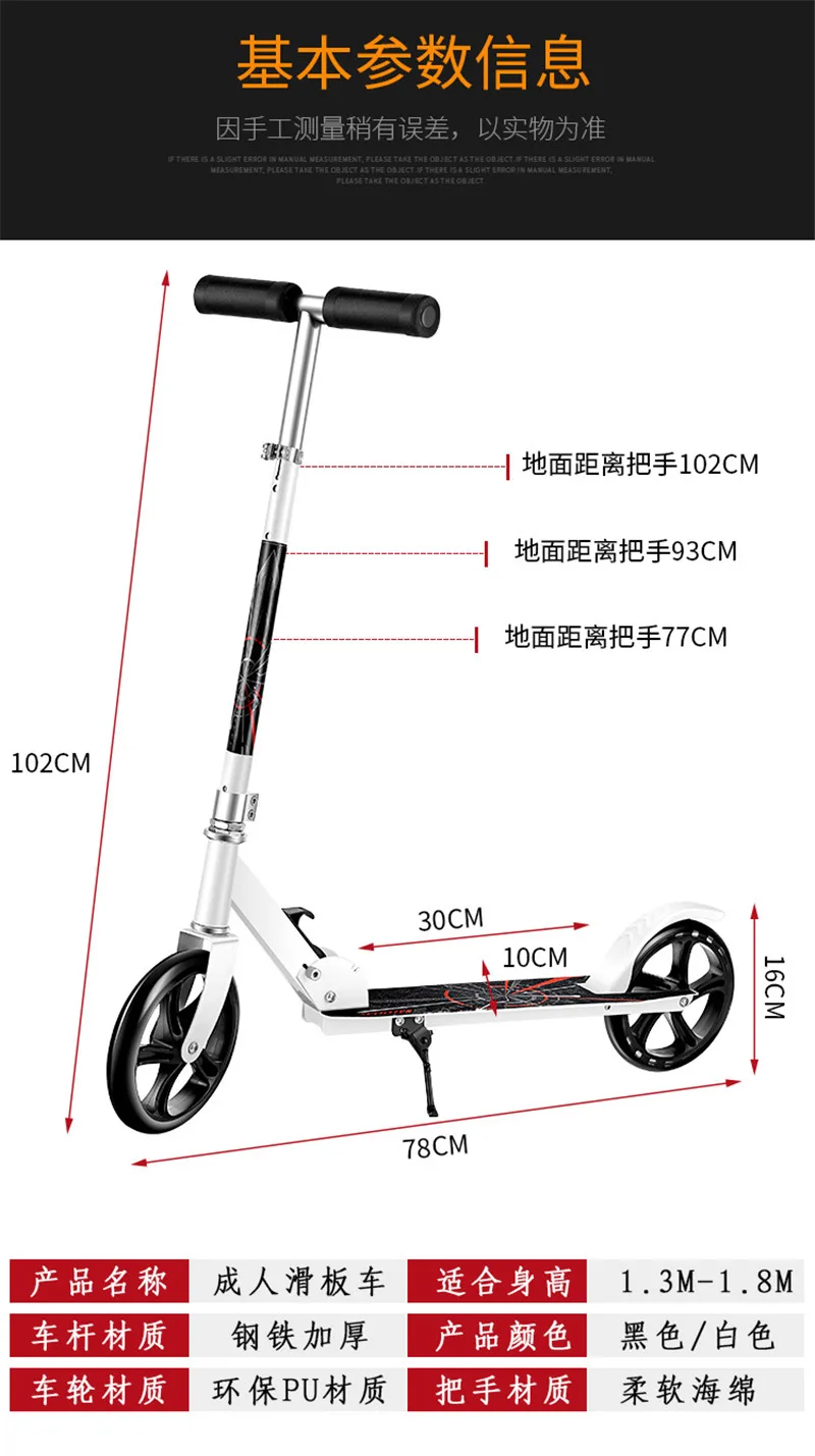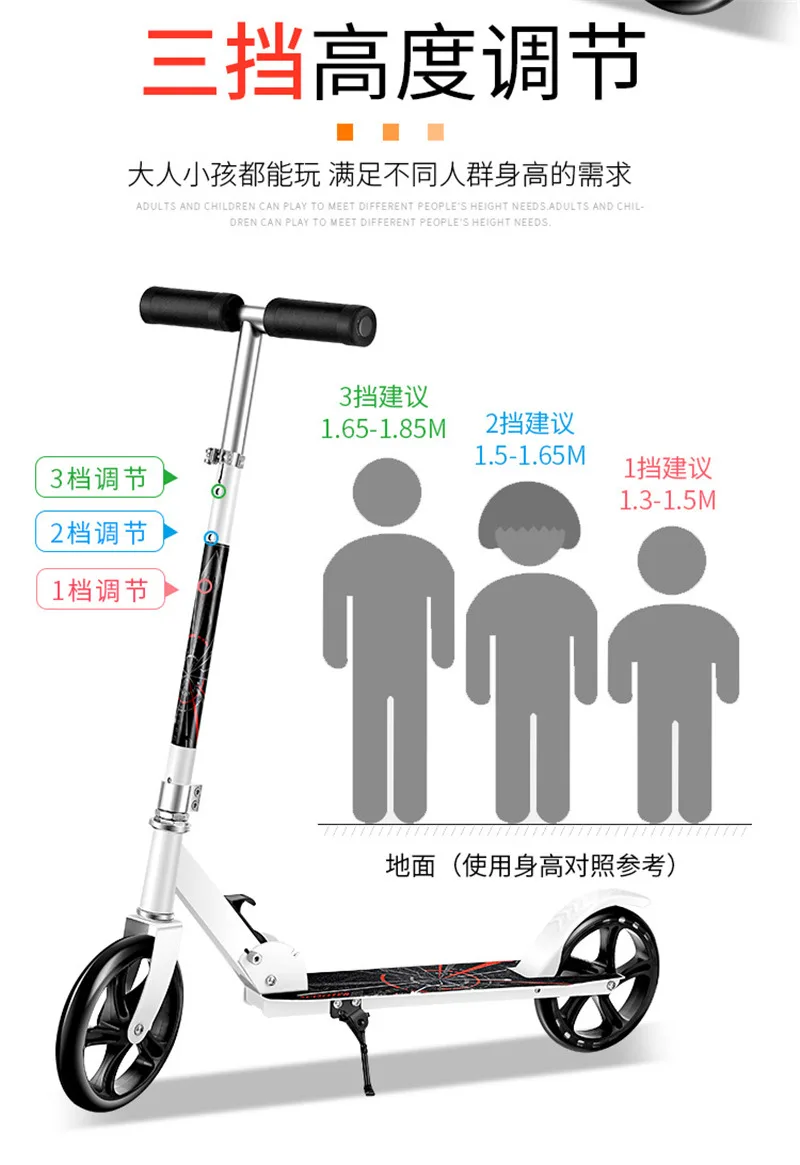 Скутер изготовлен из высокопрочного железного материала, может выдерживать вес до 200 кг; Колесо диаметром 200 мм, быстрее и удобно; Ручка может регулироваться в соответствии с ростом детей и взрослых;