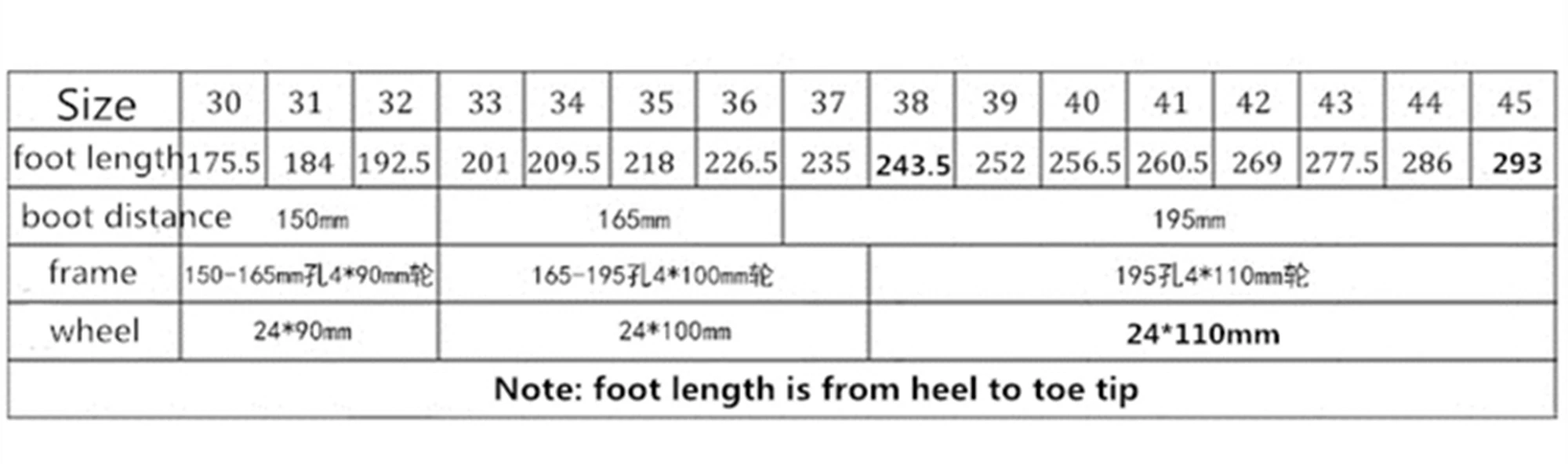1. Ботинки из углеродного волокна премиум-класса; 2. Колесо и рама 110 мм, 100 мм, 90 мм в соответствии с размером вашей обуви; 3. Хорошее эластичное прочное полиуретановое колесо 85А, сочетает в себе производительность и комфорт; 4. Черный, синий, красный, белый цвет на выбор; 5. Подшипник ABEC-11 специально разработан для профессионального скоростного катания. 6. По вашему запросу мы можем отправить 2 посылки! 7. Пожалуйста, выберите европейский размер в соответствии с длиной Вашей стопы (от пятки до кончика носка)