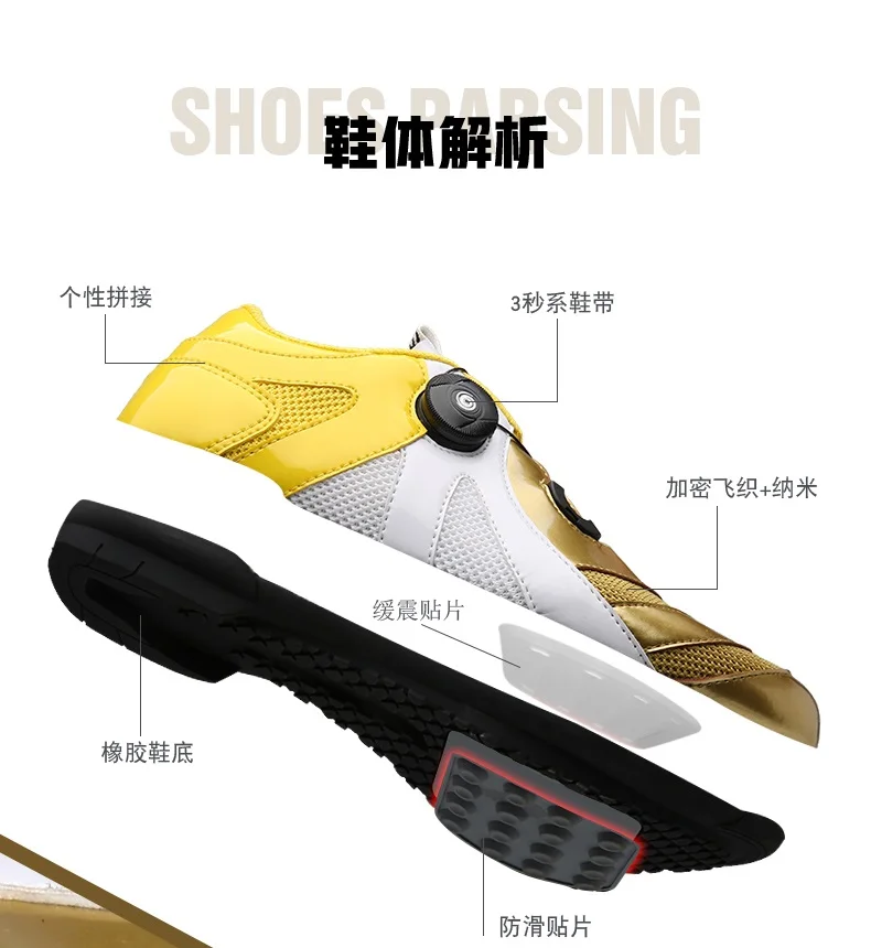 Наименование товара: обувь для езды на велосипеде Фирменное наименование: GOMNEAR Партномер: QX-998 Пол: Для мужчин Цвет: синий, оранжевый, белый, черный, желтый, красный, золотой Верхний Материал: микрофибра Подошва Материал: Резина Тип застежки: шнуровка, липучка Размер: 36/37/38/39/40/41/42/43/44/45/46