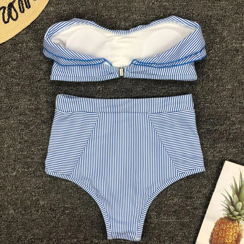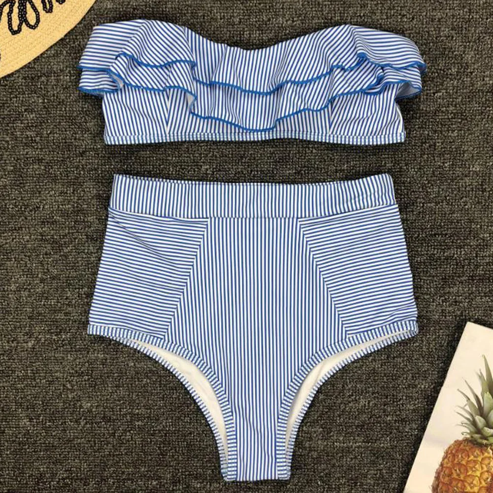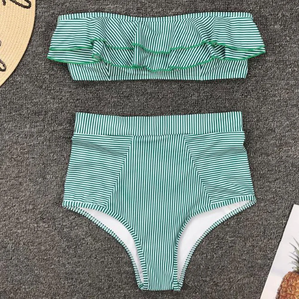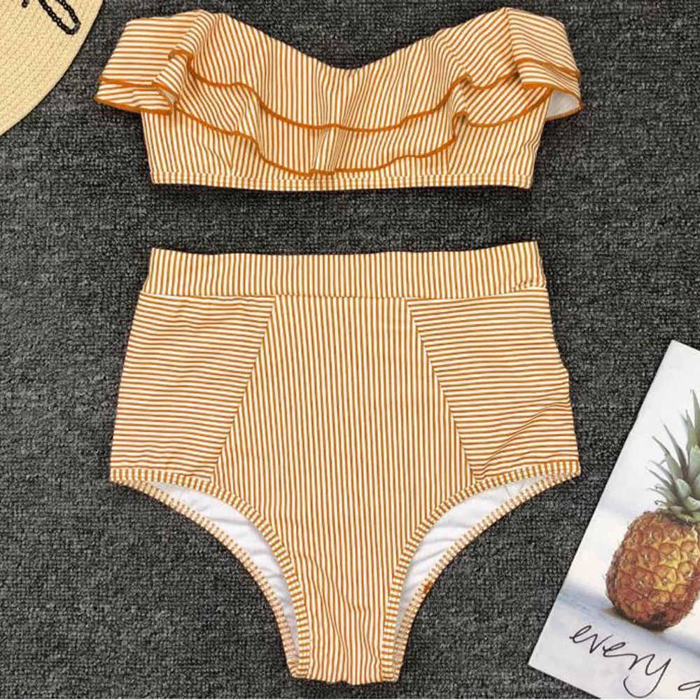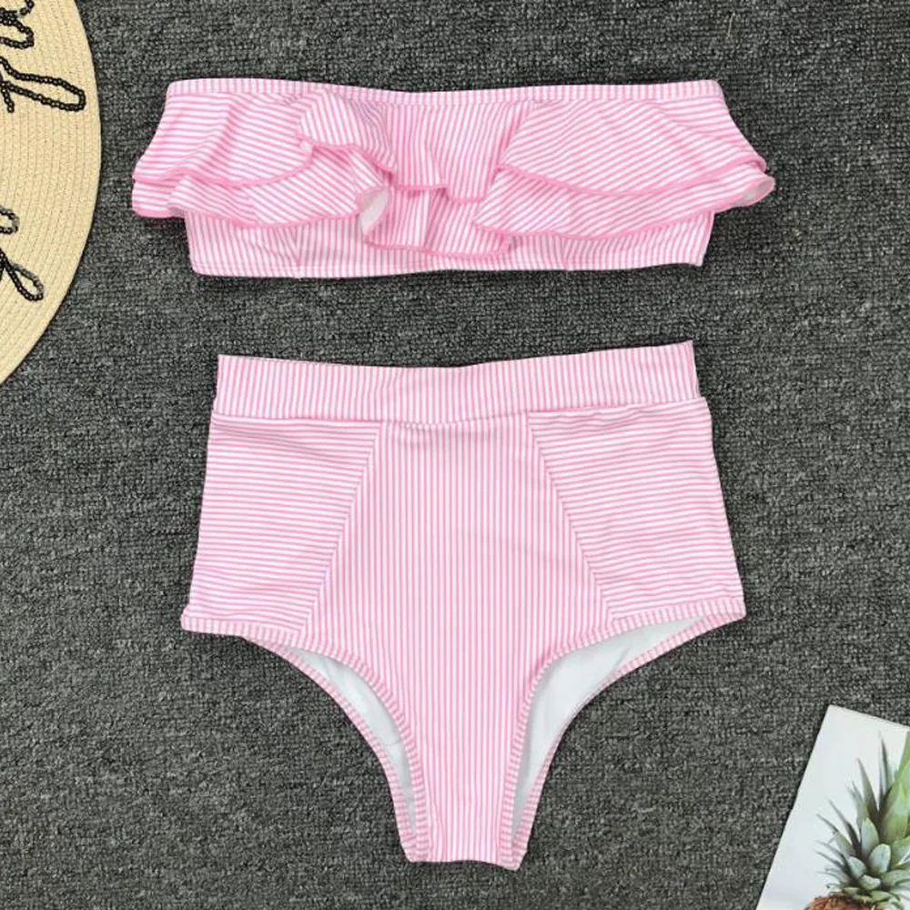 * Bikini Fabric: Polyester * Casual Swimsuit Color: Black Red Yellow Pink Blue (As pictures show) * Summer Swimsuit Condition:100% Brand New * Women Dress Description: Women Sexy Frill Ruffle Bikini Set Striped Print Swimsuit Strapless Swimwear Summer Two-Piece Suit Beach High Waist Bathing Suit * Package Contents:1*Bikini Set (NO Accessories Included)