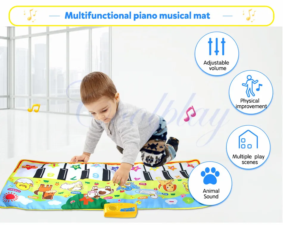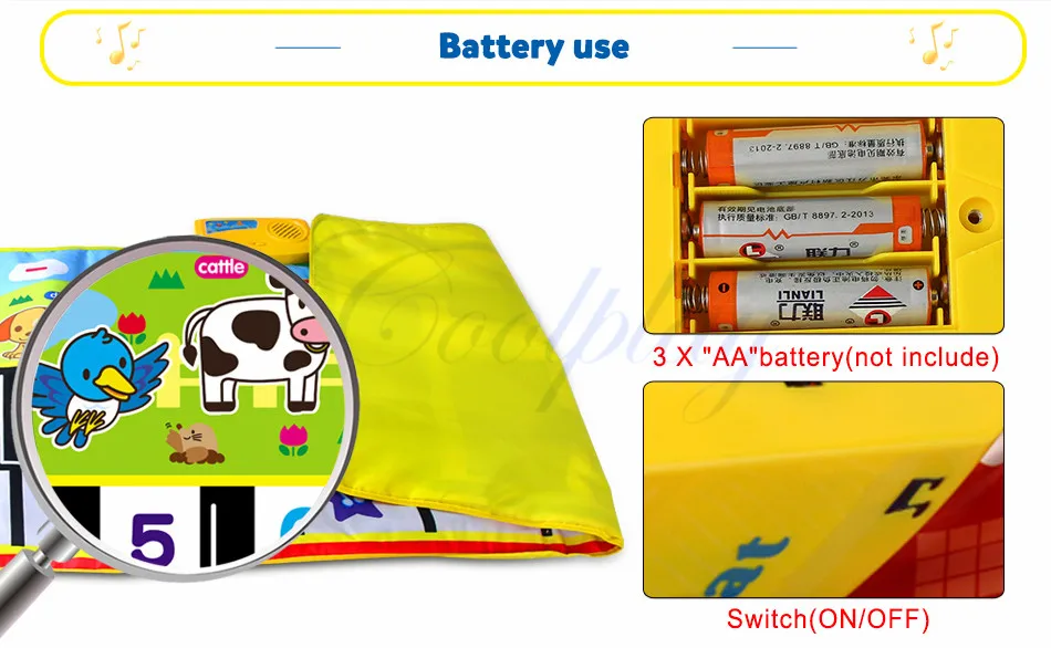 -Музыкальное одеяло имеет нескользящий слой. Но, пожалуйста, будьте осторожны при физических упражнениях на гладкой поверхности. -За Младенцами и малышами нужно следить родителям, чтобы избежать падения во время игры Коврик для пианино. -Пожалуйста, используйте цинк-марганцевые сухие батареи для этого музыкального коврика. Щелочная батарея может сжечь доску.