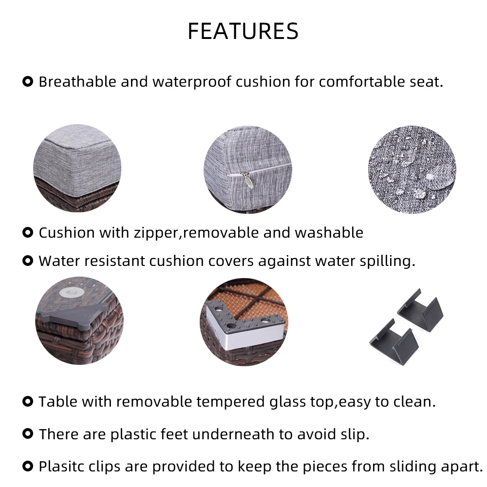 Введение: Этот угловой диван из ротанга, плетеный Полиэтилен для патио, 5 штук-лучший выбор для вас. Изделие изготовлено из плетеной серой синтетической смолы и предназначено для использования на открытом воздухе. Отличная мебель для украшения вашего сада. Классический, но простой дизайн отлично смотрится в любых условиях. Этот набор очень полезная для вас мебель. В нем есть удобные диваны, на которых вы можете сидеть, чтобы наслаждаться отдыхом. Компактный дизайн делает ваш сад изящным. Вам понравится, так чего вы еще ждете? Особенности: 1. Дышащая и водонепроницаемая подушка для комфортного сиденья. 2. Подушка на молнии, съемная и Моющаяся 3. Водостойкие чехлы на подушку против распыления воды. 4. В таблице со съемными закаленное стекло топ, легкоочищающийся. 5. Есть пластиковые ножки, чтобы избежать скольжения. 6. Пластиковые зажимы, чтобы держать детали от скольжения. 7. Всепогодная устойчивая к УФ-излучению полиэтиленовая плетеная, прочная стальная рама. 8. Секционный диван будет иметь идеальную форму для любого пространства. Технические характеристики: 1. Материал: сталь, плетение 2. Цвет: коричневый 3. Грузоподъемность в таблице: 165lb / 75 кг 4. Грузоподъемность диванов: 330 фунтов/150 кг 5. Размеры в таблице: (25,6x25,6x12,5) " / (65x65x31,5) см (Д x Ш x В) 6. Размеры дивана без рукавов: (29,5x25,6x25)" / (75x64x63) см (Д x Ш x В) 7. Размеры углового дивана: (29,5x29,5x25)" / (75x75x63) см (Д x Ш x В) 8. Пуфик Размеры: (30x30x12,6) " / (76x76x32) см Размер упаковки (Д х Ш х В): 8. Защита экрана из закаленного Стекло Размеры: (25,6x25,6x0,2) " / (65x65x0,5) см Размер упаковки (Д х Ш х В): 9. Толщина подушки: 4" Посылка включает в себя: 1 х диван без рукавов 1 x настольная лампа 1 x Османской Угловой диван-2 шт. 2 х подушка 9 x подушка 1 x закаленное стекло Сумка для аксессуаров-1 шт. 1 Инструкция по монтажу